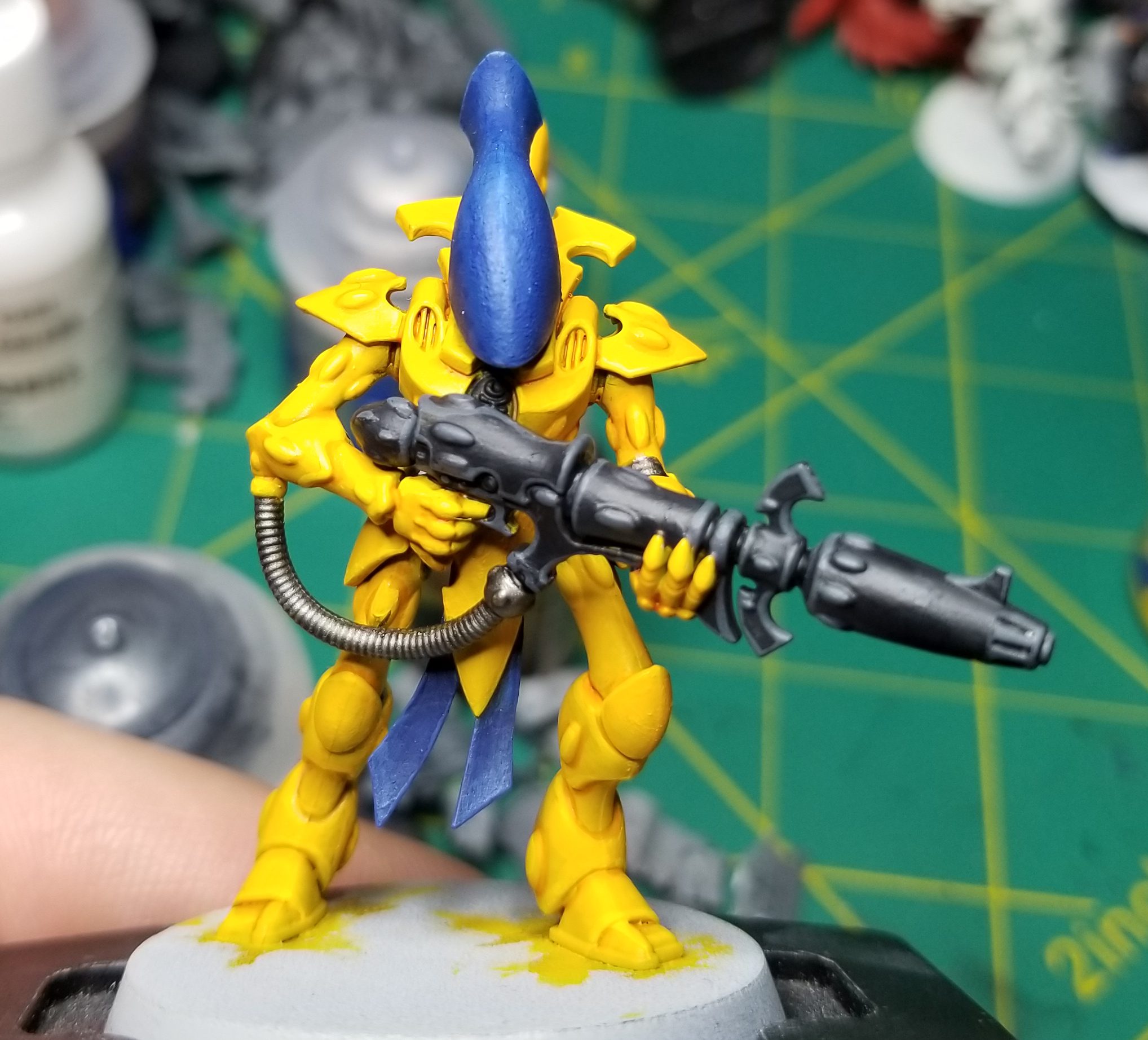 Using a Grey Seer Undercoat, I've simply smooshed on a couple coats of Contrast Iyanden Yellow and then I had a crack at masking using some cheap blue masking tape to paint the Contrast Ultramarines Blue... Next time I'll shell out for the proper hobby masking tape or maybe even the putty.