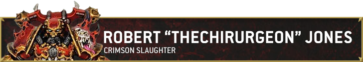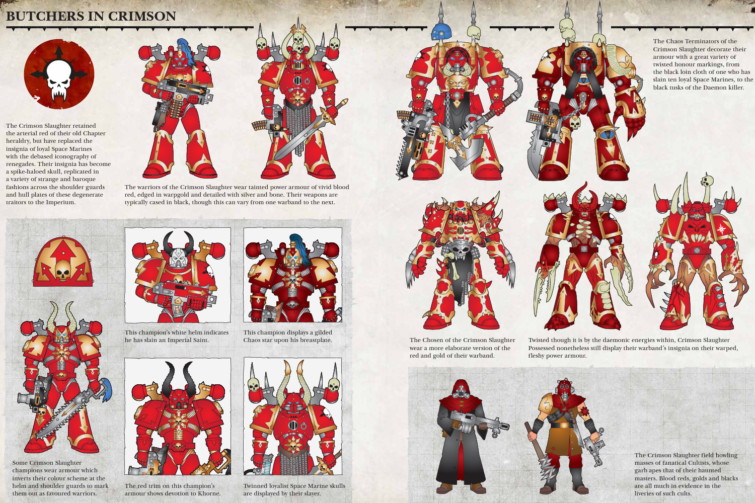 The Crimson Slaughter are a Chaos Space Marine force with a strange place in the history of Warhammer 40,000. Lorewise they were once a loyalist chapter known as the Crimson Sabres, but began to walk the path of damnation when their chapter became haunted by voices that only bloodshed and violence could silence. Excommunicated by the Imperium, the Crimson Sabres fled to the Eye of Terror and became corrupted, and thus the Crimson Slaughter were born.