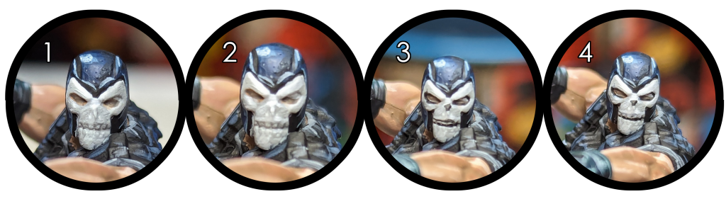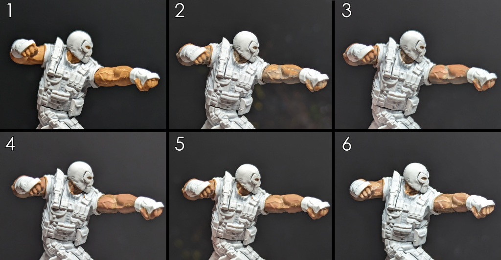 credit: Brushwizard1. Shadows: Citadel Administratum Grey Reinforce shadows by painting Administratum Grey in the recesses and areas that should be in shadow 2. Highlight: Vallejo Model Color White Highlight areas with white. 3. Dark Lining: Vallejo Model Color Black Paint black info the mouth, around the eye sockets and in the nose hole, if needed touch up black lining around the skull mask too. 4. Touch Up: Vallejo Model Color White Touch up any areas with white as needed.