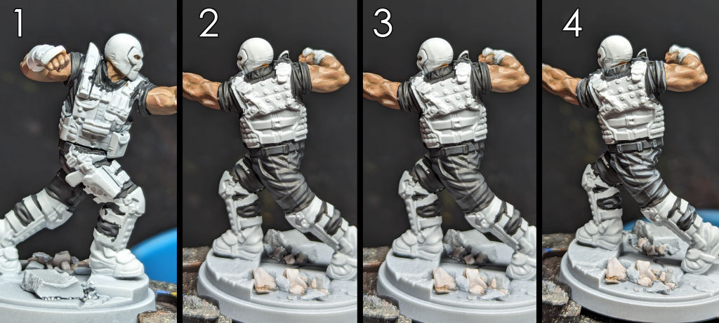 Like Red Skull, Crossbones costume is predominately black. Unlike Red Skull, Crossbones has no less than four different materials and fabrics that are black. So that's fun. His miniature is filled with details and it's easy to lose track of what's what on him from table distance. For that reason, we'll be splitting him up into four different black color schemes. We'll steal the scheme from the Red Skull's coat for Crossbones' pants and shirt, we'll also use the same scheme from Red Skull's black leather for Crossbones' boots, gloves, belt and gloves. This dude is covered in military webbing and enough pouches to make Liefeld swoon, we'll make all that stuff its own color scheme and finally his helmet and knee and shin pads need to look like it's made of either hard plastic or painted metal. That's a lot!