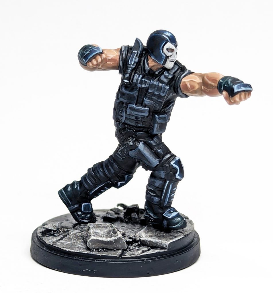 We're going to take a page out of the same book we used on Red Skull and split his clothes and tactical gear into two color groups. We're going to start by painting his shirt and pants Vallejo Black Grey, like we did on Red Skull.