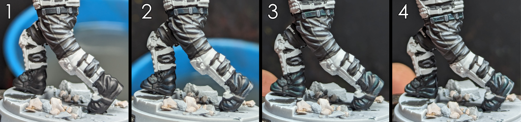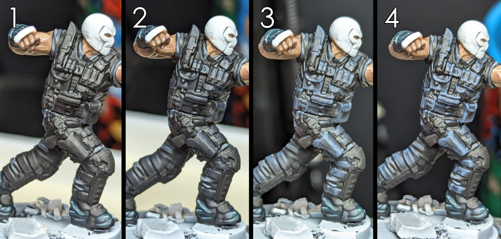 credit: Brushwizard1. Basecoat: Vallejo Model Color Black Next up we'll base coat all of the tactical gear Black. 2. Layer: Vallejo Model Color Black: Citadel Dark Reaper Layer up the belts, pouches and armor padding with Dark Reaper and Black mixed together 3. Edge Highlight: Citadel Dark Reaper Highlight the edges of all of the gear with Dark Reaper 4. Edge Highlight: Vallejo Luftwaffe Uniform WWII Do one more pass of edge highlights with Luftwaffe Uniform WWII