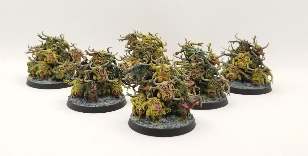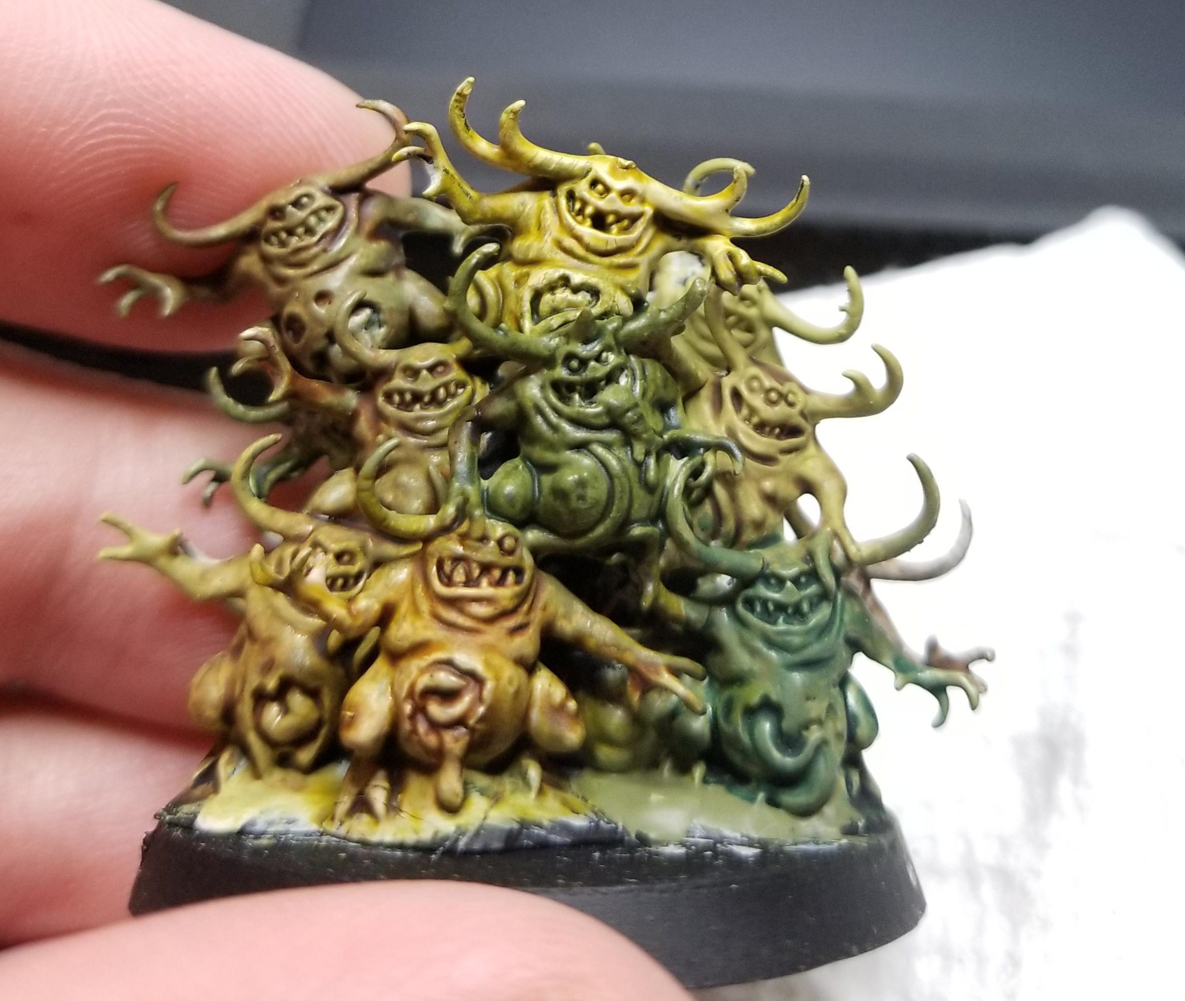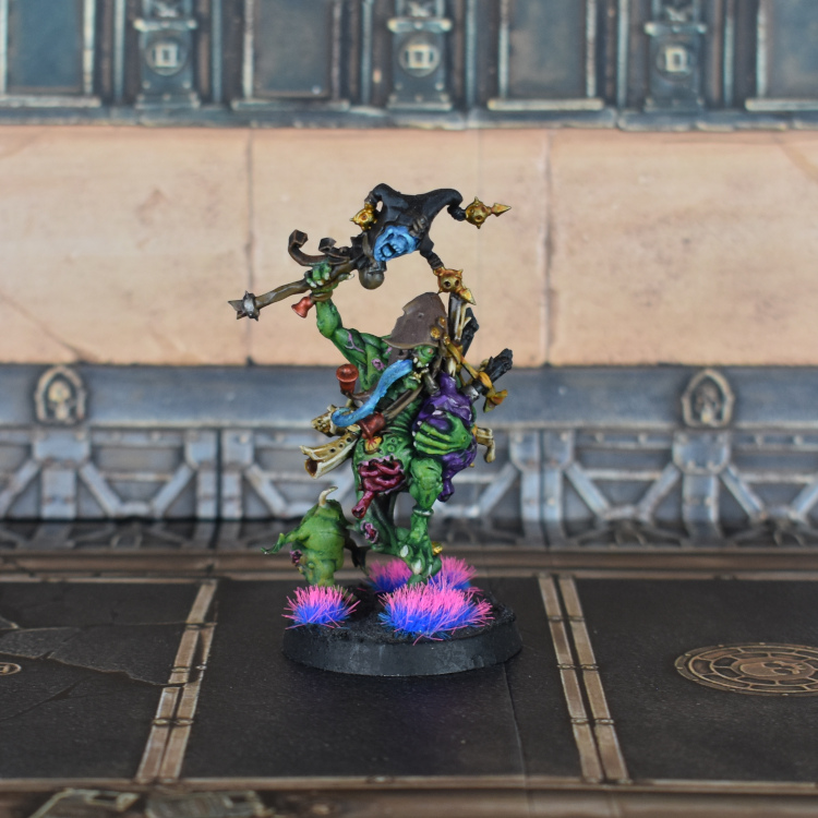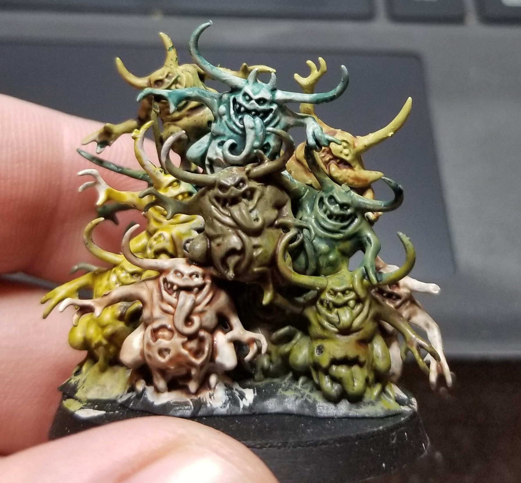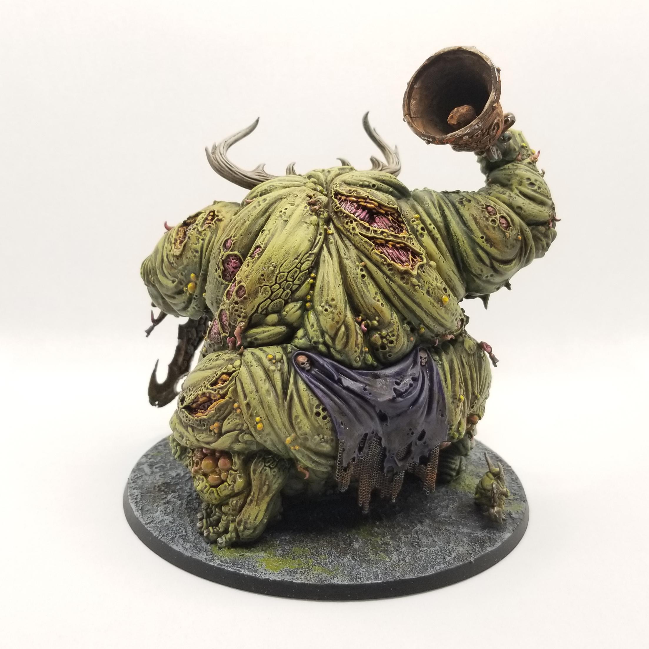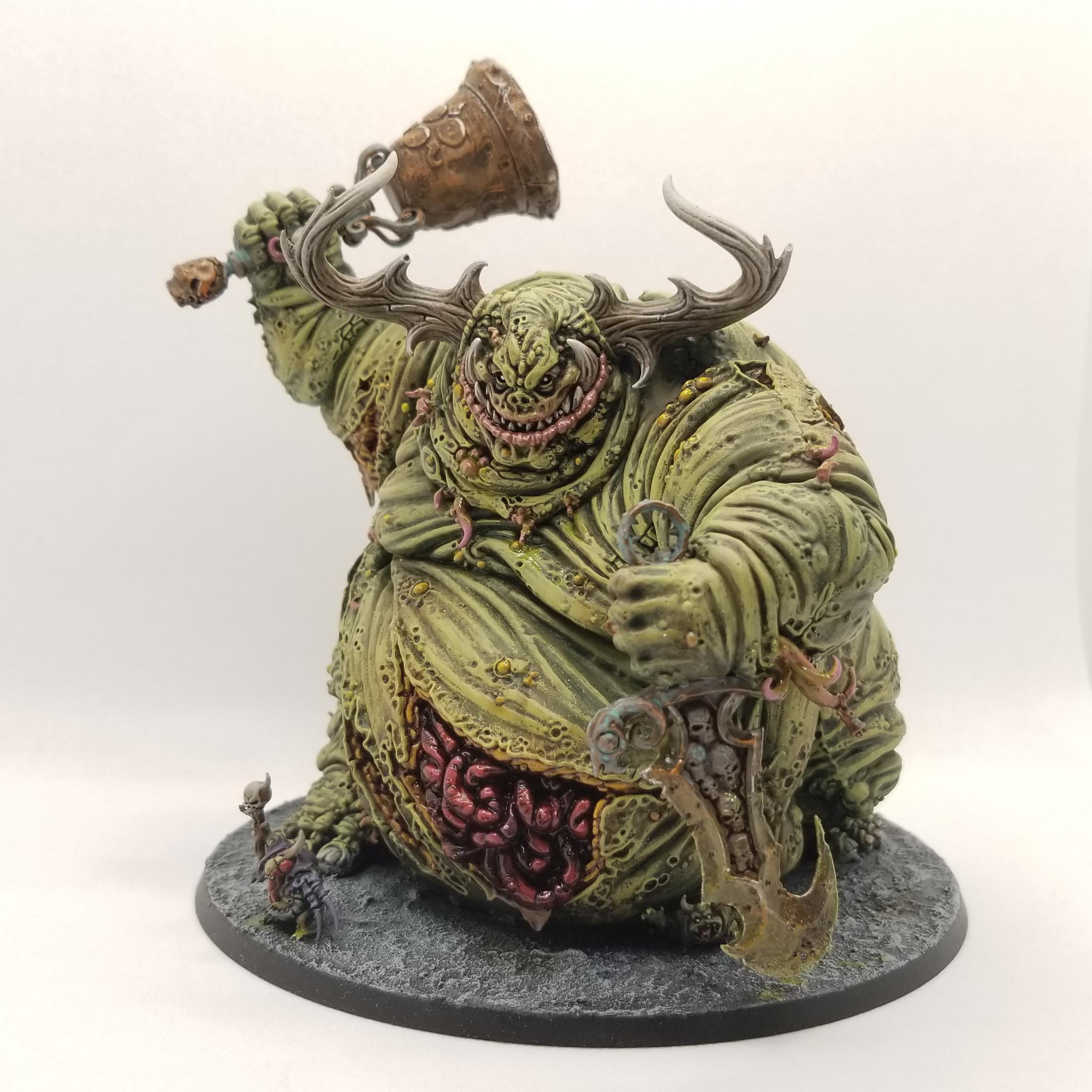 Using the general approach of starting with highlights/lowlights, basing Elysian Green, working up to a desaturated cream highlight, adding green saturation via an ink, then painting the details works for any other Nurgle model too, such as Plaguebearers and Nurglings. Try to make your darks super dark and your brights super bright, while choosing colors that create visual interest, and it's hard to go wrong.