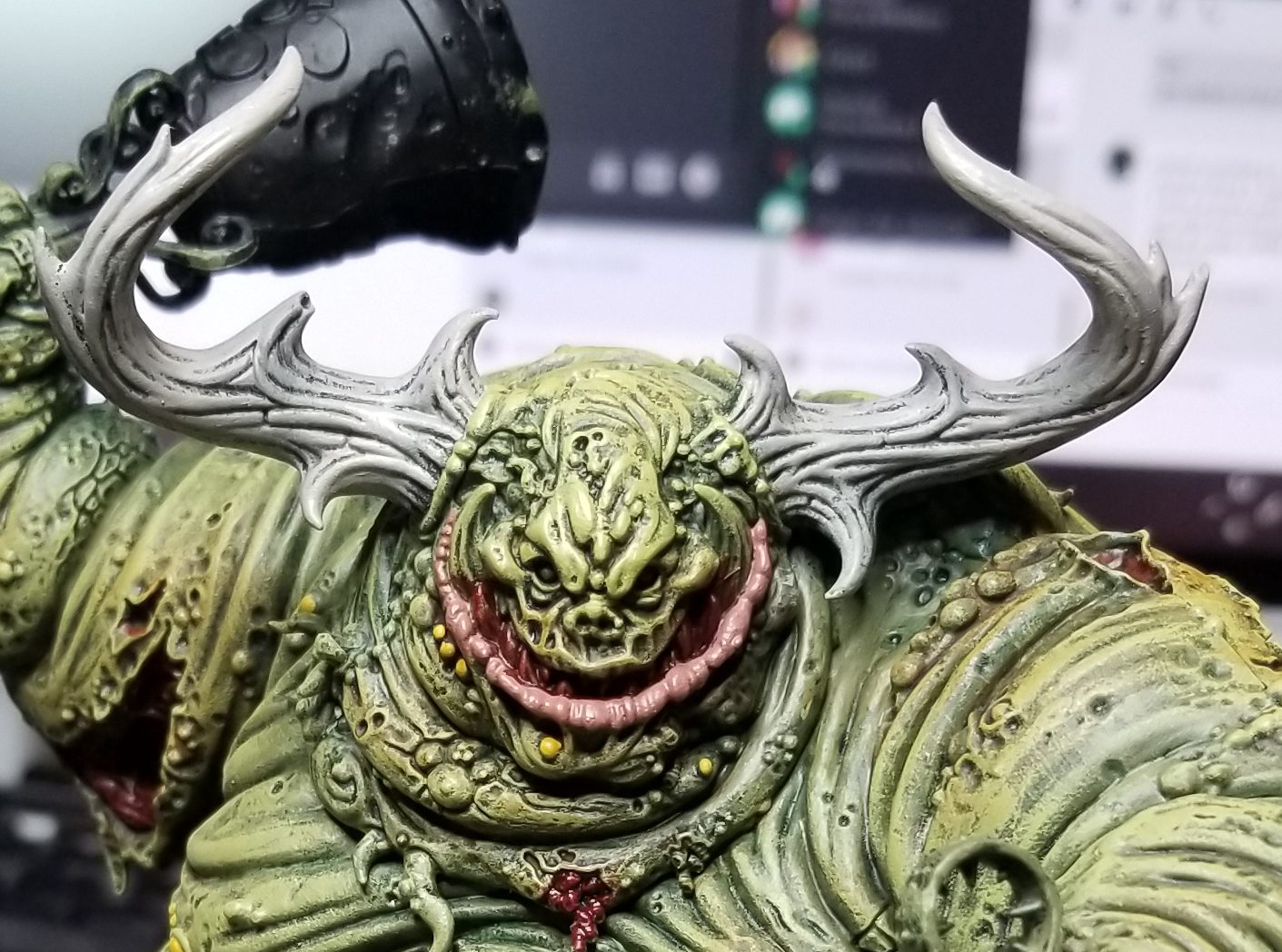 Final details on the face. I pick out the rest of the tentacles and pustules with Bugman's Glow, then highlight them with Emperor's Children. I also pick out the edges on parts of the horns with Reaper Polished Bone, and I pick out the blisters with Averland Sunset. I coat the mouth in 'Ardcoat to give it that wonderful "wet" look, and then I hit the pustules and blisters/pimples with Nurgle's Rot to give them a snot-covered gloss.