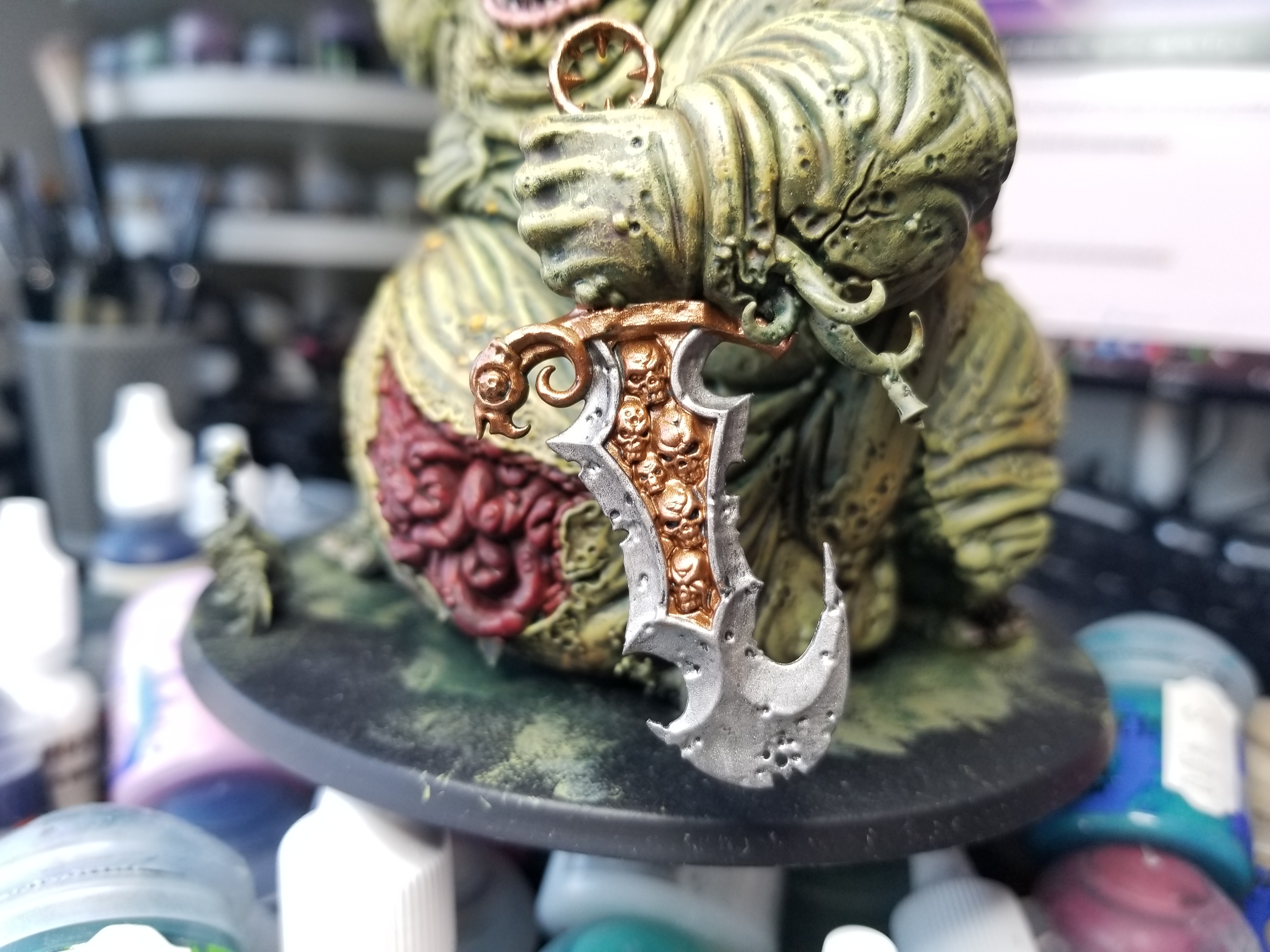 Credit: Brandon FoxThe swords that my plaguebearers have I paint a basic grey. I use the Vallejo London Grey because it’s the color I already own. My concept was that they just have sharp rocks that they hit you with. They’re washed with Nuln Oil and any highlights are done with more of the same grey. Metals I pretty much only do one of two colors – Silver for most metal chunks and Brass for trim and accent bits. Vallejo Gunmetal for silvers washed with Nuln Oil, and Balthazar Gold washed with Agrax for brass. Each highlighted with the same color. This is mostly for lack of owning other metallic colors more than anything. I only recently picked up some of the Nickleback Oxide (or whatever) and have used it on the brass which makes some nice corrosion effects. I’ve used some of the Typhus Corrosion as well, on the silvers. It’s OK too, but adds more of just a dirty look than a corroded look in my opinion. Wounds, Blisters, and the like.