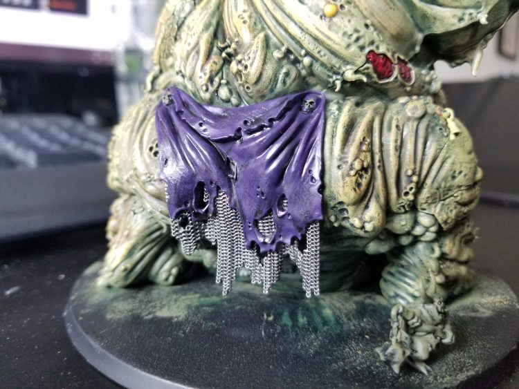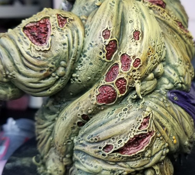 I should note that, against recommendations of everyone I know, I prime all my minis white. I’ve done black but, overall, I find the white makes the colors brighter and pop more. The black gives a ‘grittier’ feel maybe, but in an army prone to darker dingy colors of rot and decay that can end up with a dark, muddy feeling model. There’s nothing saying that disease has to be dark – the diseases teem with a life all their own. It doesn’t have to be all rot and decay – they don’t call them bright bruises for nothing.