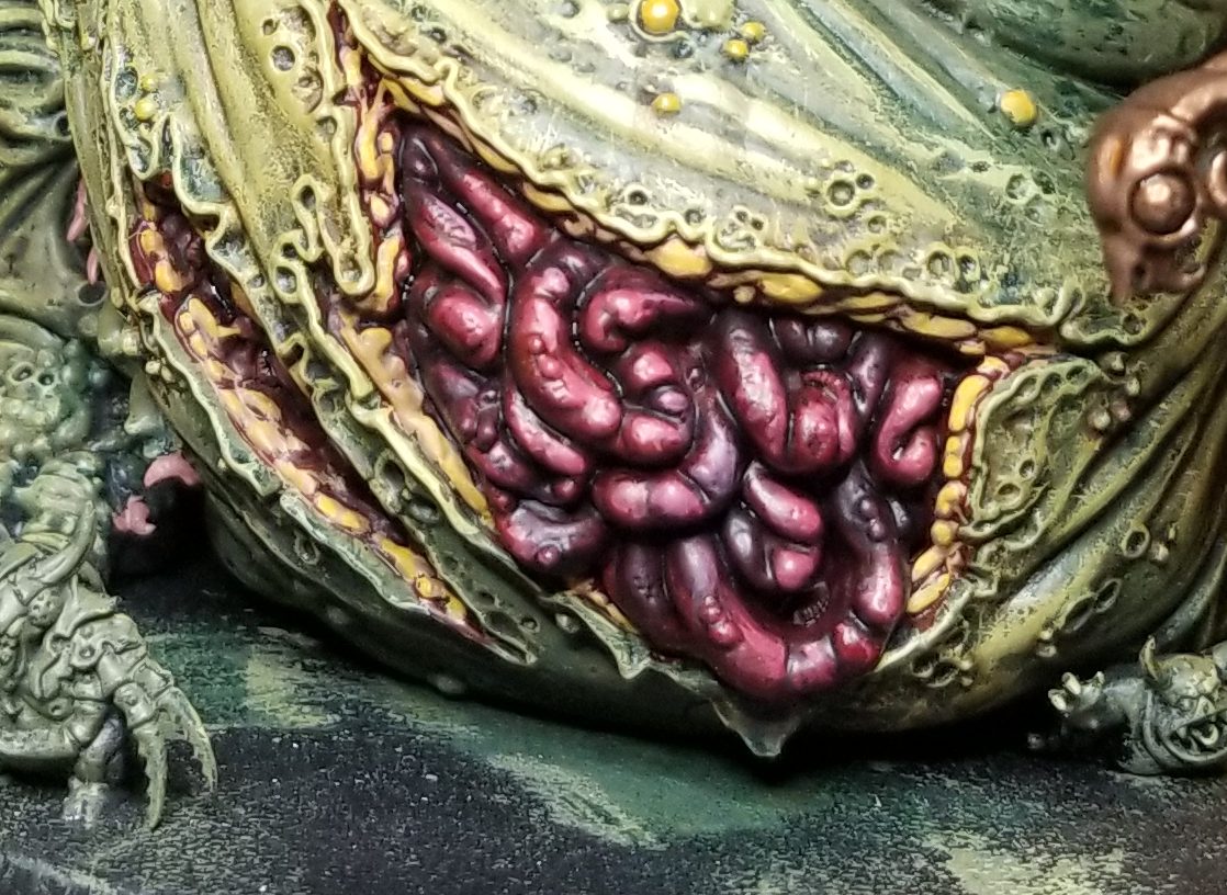 Sloppity Bilepiper. Credit: CorrodeThe Sloppity Bilepiper is one of the best-named units in Warhammer, and it's great fun to paint, too. I started by priming Wraithbone and then washing the whole thing in Wyldwood, which gave a nice brown base to start from. The main part of the model is the skin, which was going to be green, so I heavily drybrushed the skin Waaagh Flesh, then Warboss Green, then Skarsnik Green, with an additional yellow layer on the Nurgling to make it a bit lighter. The skin on the Bilepiper itself also picked up a couple of yellow highlights in the knuckles and on some of the other highest edges. This was all washed Biel-Tan Green. The guts were painted Emperor's Children Pink (was were the ragged edges of flesh around them, as you can also see on the other open wounds e.g. on the knee) and then washed Carroburg Crimson to give them a real bloody feel. I think I also gloss varnished them. The veins were similarly picked out in Emperor's Children Pink.