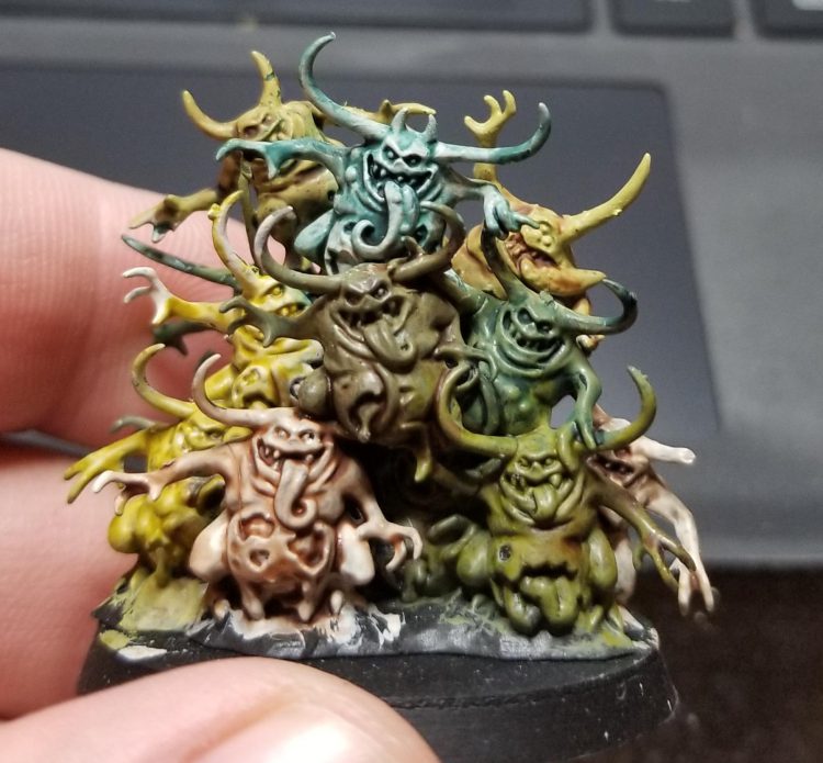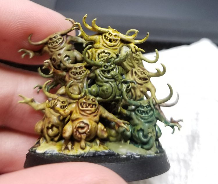 Credit: Brandon FoxThen we wash the dirties. For the hordes and the Nurgling piles I tend to pick every wash I own. I have probably tried them all at this point, and I can’t say any haven’t worked. I think I use 5-6 different washes, and just pick clusters of dudes to wash those colors. Using 5 washes on 30 plaguebearers that’s 6 each color, which gives you enough of a mix that your horde looks varied but still like they belong together. Same thing with the Nurgling piles – I picked a few in each pile to wash each color to make a nice mix of teeming mischief makers. If you want names, I’ve used the Biel-Tan Green for that classic green look, Agrax Earthshade for a nice dirty look, Reikland Fleshshade or even Carroburg Crimson for a more gritty/bloody look, Druchii Violet over green makes a grey sort of flesh color, and I’ve even used the Drakenhof Nightshade and Coelia Greenshade on the Nurgling Piles. One thing I’ve learned is the lighter the greens you base coat with the more varied effect the washes will have.