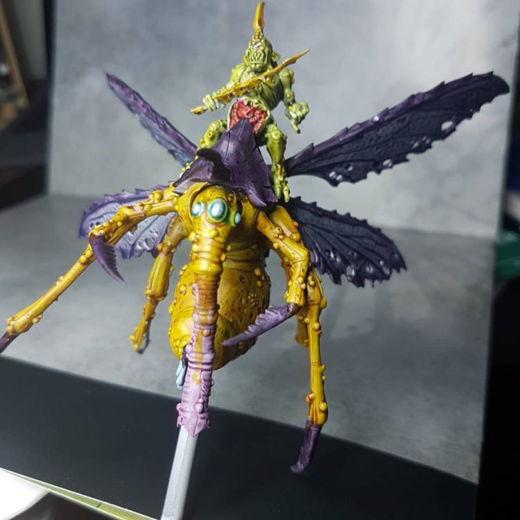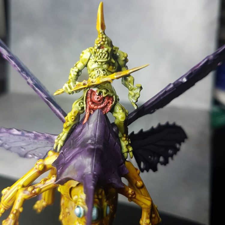 Plague Drone Plaguebearer Rider - Credit BeanithBosh, the first of three Plague Drones ready to flit about the field and your untidy desk buzzing merrily away ready for "checks notes from Start Competing Chaos Daemons" smash into your foes in hand to hand and wreck face.
