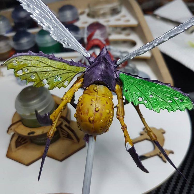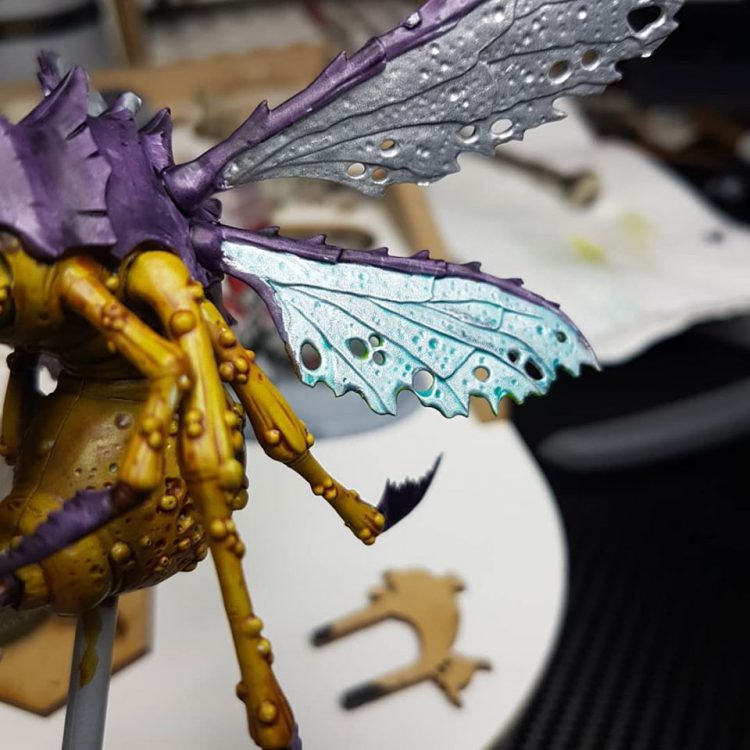 Here I experimented with some various Contrast colours over Runefang Steel Layer on the wings trying to find a new shimmering effect on the wings. I’ve tried Contrast Ork Flesh, Contrast Plaguebearer Flesh, Contrast Magos Purple and Contrast Aethermatic Blue.