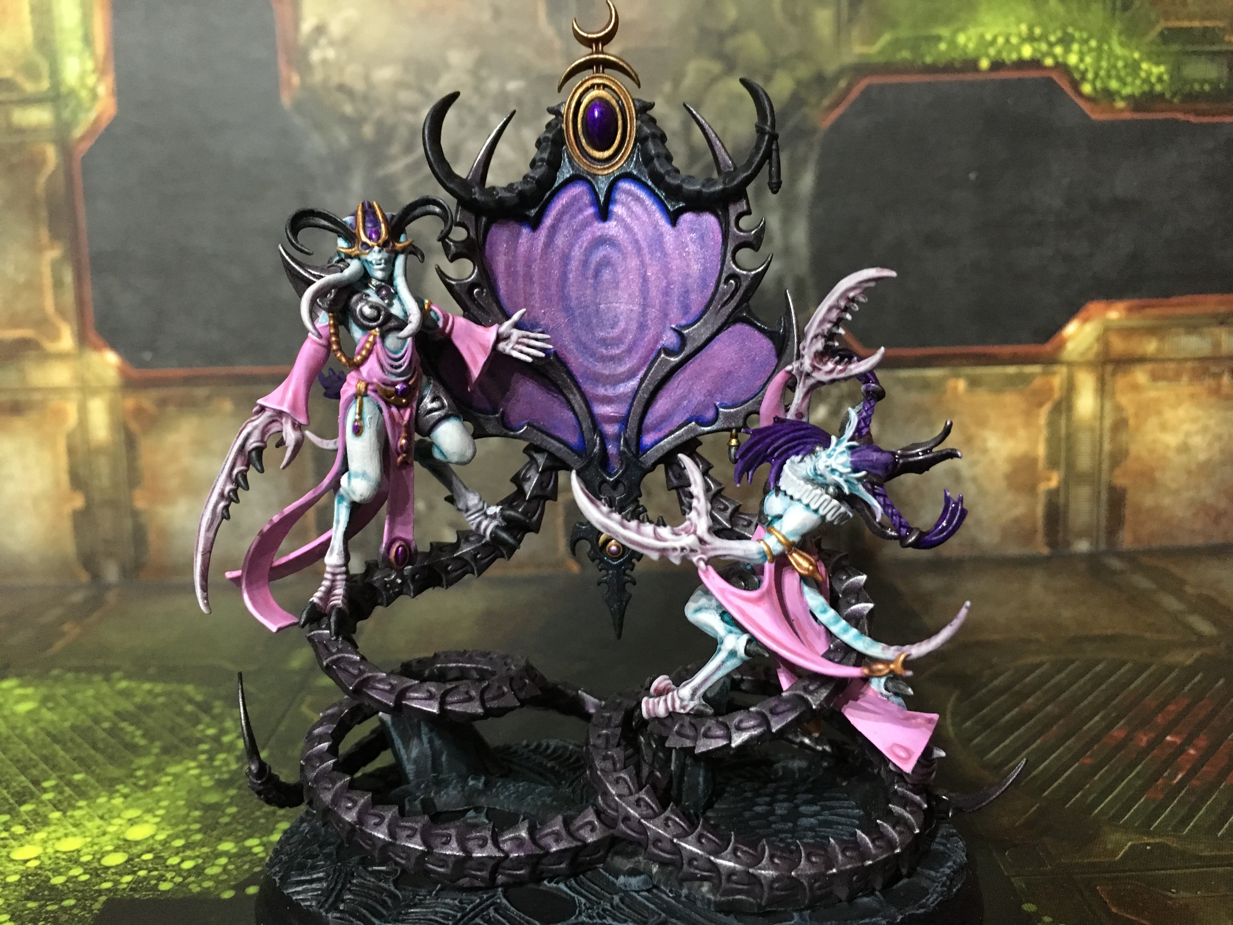 The Daemons of Slaanesh are twisted representations of desire and perversion, often intersexed and with lithe forms that move in beguiling ways. The daemons of Slaanesh thrive on temptation and obsession, feeding on mortals' pride.
