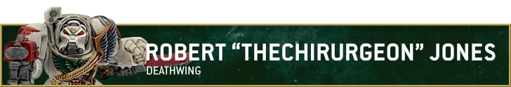 Dark Angels marines wear their company markings on their left kneepad. Deathwing marines instead use their left kneepad for squad and personal heraldry, often sporting designs with some special significance to the chapter and its history.