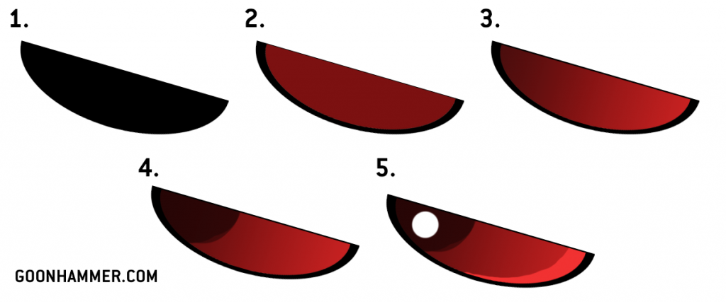 The process for painting lenses is the same as painting gemstones. You generally want to start with a black area (or darkened), which you'll work inside, leaving a small line of black around the edge as you go. Start by painting your base color. If you're painting red lenses, this will be