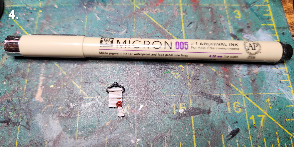 Now it's time for the lettering. The "correct" way to do this is to use a very fine pointed brush and and paint lines with a dark brown. But if you want to go faster and have an easier time with it, I'll let you in on a secret: Micron pens. The .005 pen gives you a very small point and is perfect for drawing the lines that work on something like this.