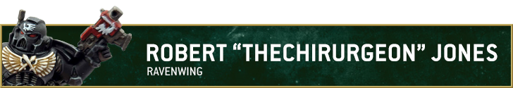 In the 41st millennium, the Dark Angels are one of the most distinct chapters of Space Marines, with striking green armor, bone-colored robes, and different color schemes for their first and second companies, the Deathwing and Ravenwing, respectively. Even their more standard marines often don bone-colored robes and cloaks, while their iconography often includes wings and swords.