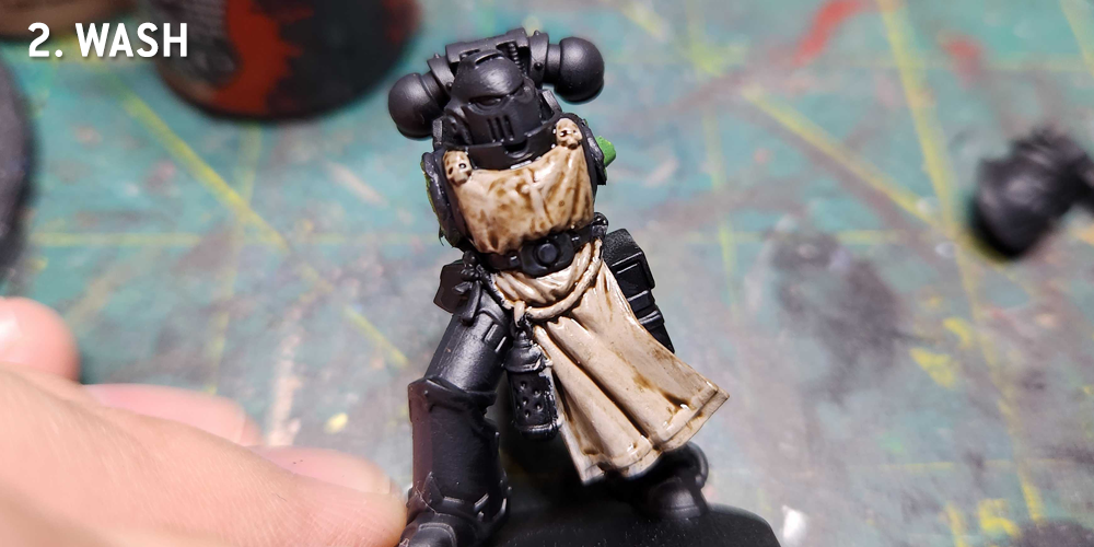 Agrax Earthshade. You could also skip wash painting in this step and use mixes of Agrax and your bone colors for fills between folds. This will darken the whole thing but will also help you understand where your folds are going to be.