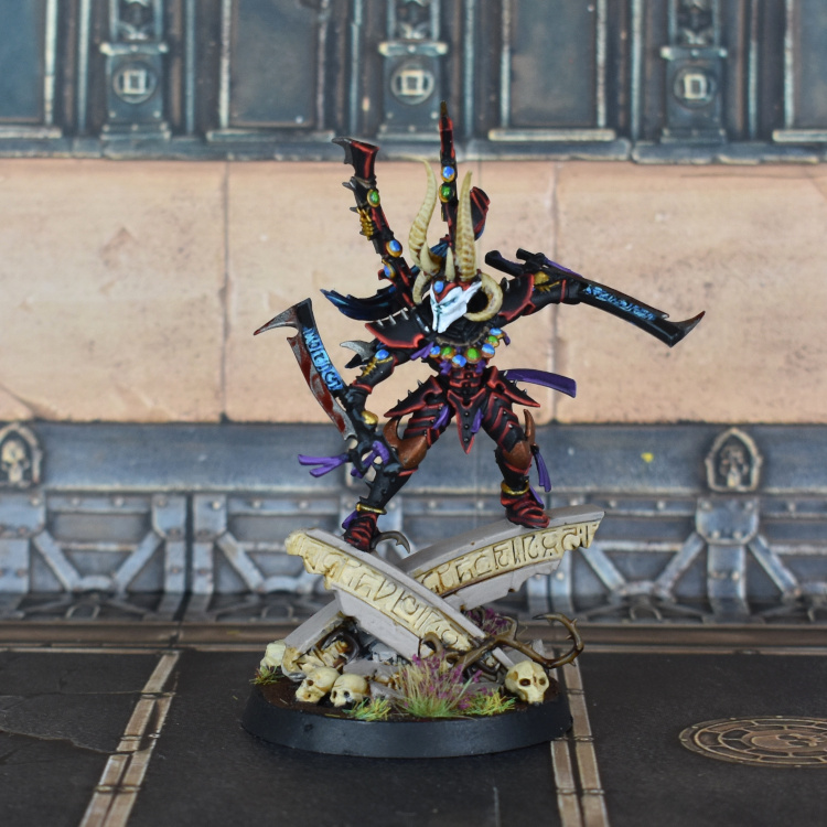 I knew I wanted him to be different from the rest of my Drukhari, since the Incubi temples are a separate mini-faction within Commorragh. In the end what I settled on for Drazhar (and for future Incubi) is a scheme which is similar to what I used on a few of my Talos - black armour with a progressive red highlight . This was achieved with VMC Black on the armour itself, and then a thick highlight of Khorne Red, then progressively thinner layers of Mephiston Red and Wild Rider Red.