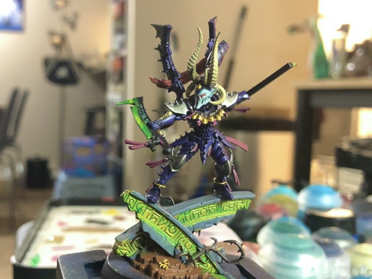 When they announced the new Drazhar model to accompany the new Incubi with the new Psychic Awakening box set, I was pretty hype. The updated model for the Master of Blades was breathtaking. Combined with the fact that the old Incubi models were one of the big reasons I had started collecting the Drukhari almost a decade prior, I took the HEFTY price tag for the box set to the teeth on day one and assembled him before I had to go in for my job that day. Then I didn’t touch him for almost a year. I did play one game with him, but right around when Drazhar dropped was when I went on a big Final Fantasy XIV spree and I wasn’t painting much. I finally got around to him earlier this year as a palette cleanser for the Admech I was working on getting painted. In the end, I’m glad I did wait to paint him. Not only is it very intimidating to paint a character with such a great model as his and I needed to get over this painting fear (I goofed up the new Abaddon’s face and I still have nightmares), but quarantine gave me time to really improve my skills and saw the release of some paints I would use for this model to great effect.