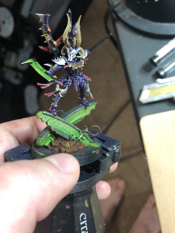 Finally, the Green Glow. Everyone is excited about this when I show them my Drazhar, so I figured it would be best for me to save it for last. To answer to most burning question: yes that is Tesseract Glow. But theres more too it. To start, I hit the blades with Leadbelcher and the inner runes on the pillar with Retributor Armor. This way the original color of the metals shine through just a hair. Then go to town with Tesseract Glow after giving the bottle a good shake. Don’t let it clump up anywhere of course, but it tends to be more yellow in the areas you want to be brighter and more green in the recesses. Outside of painting it straight on something like Grey Seer, it’s a bit subtle, but we are gonna fix that with some tricks. For the gold, I drybrushed on some Liberator Gold, hit it again with a thinner layer of Tesseract Glow and then just a bit of a Sigmarite drybrush. Gold shines through just a hair this way. Then on both the Klaives and the Pillar, I hit the recesses with Hexwraith Flame. It woks very similarly to Tesseract Glow, but the normally very bright green of Hexwraith Flame actually works perfectly with the outer green areas of Tesseract Glow to make the brighter yellows of that paint more intense.