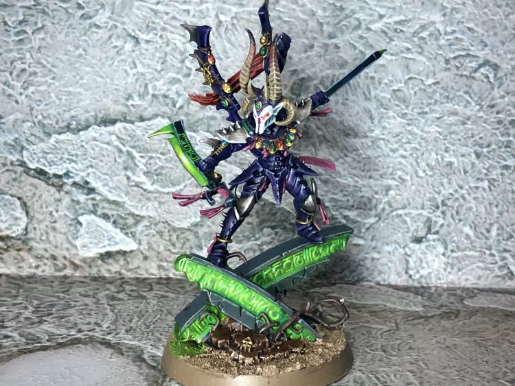 Drazhar himself largely perches on the Aeldari version of a hero rock, a bit of broken temple, but he has some little branches I picked out in Steel Legion Drab and added some skulls to suit the Executioner of the Incubi Temple. He gained some Blood for the Blood God on his blades, too.