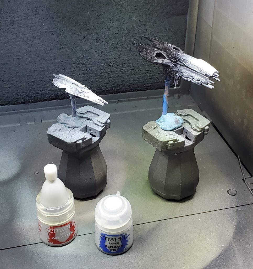 Unlike my Battlefleet: Gothic ships (which were simply base coated and drybrushed), I knew I'd go the other direction for the UCM fleet, largely because the texture isn't as pronounced and because I wanted a "cleaner" look. That meant rather than starting dark and highlighting, I'd start lighter and use a wash to darken everything down to the tone I wanted. The base coat for my fleet is Vallejo Neutral Gray, which is a nice mid-tone with which to begin. Like most of the Vallejo grays, it also dries just a hair darker than it is when wet.