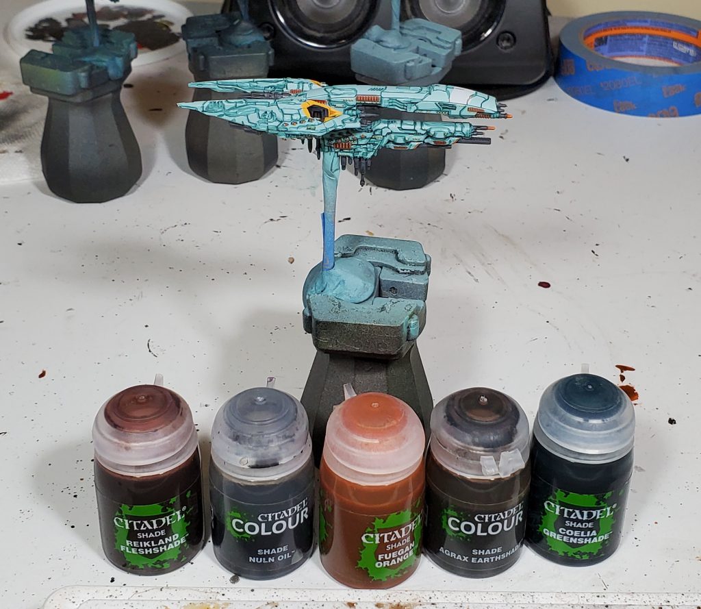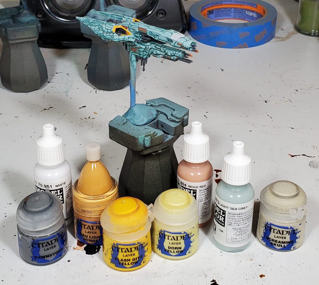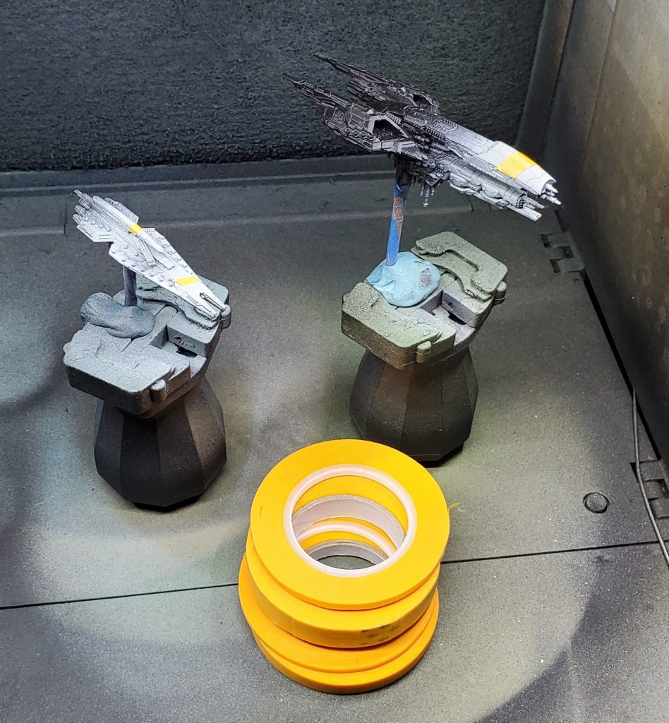 Next up mask off the where you want the stripes to be, for this I am using the pile of different widths of Vallejo masking tape I have. You can play around with the number and width of stripes you use to help differentiate the ships, but with the masking done its time to do the main coat!