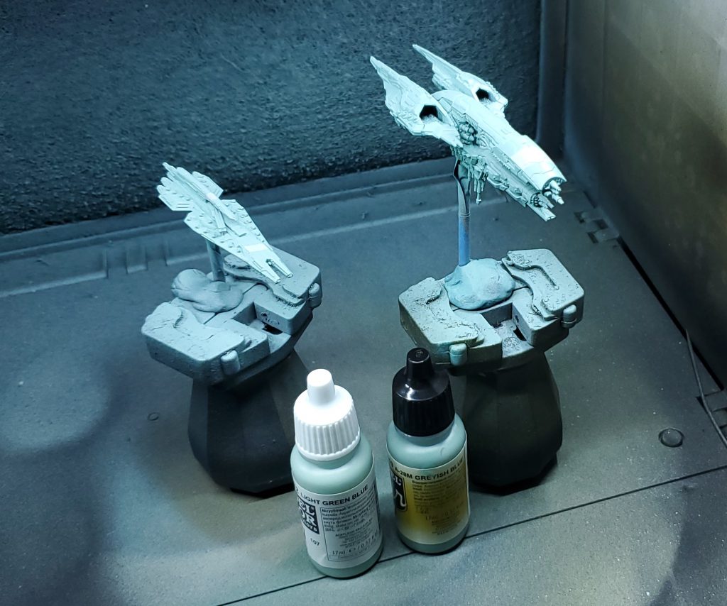 For this I cover the models in VMA A-28M Greyish Blue with a zenithal of VMC Light Green Blue, the contrast will start as looking fairly stark but will look fine once we get the rest of the colours down.