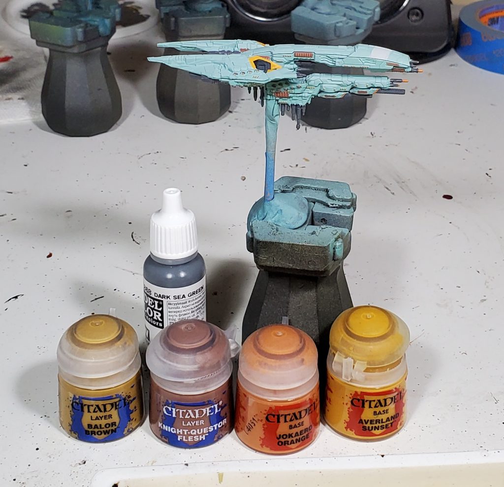Now it's time to pick out all the final details. I painted the interior of the engine exhausts Pale Orange, a color which contrasts nicely with the teal of the accent panels. The missile launcher bays of the Taipei frigates were given the same color (also with white underneath to help the color pop). I also went back in with Runefang Steel and picked out a few details on the hull just to add a little bit more visual interest.
