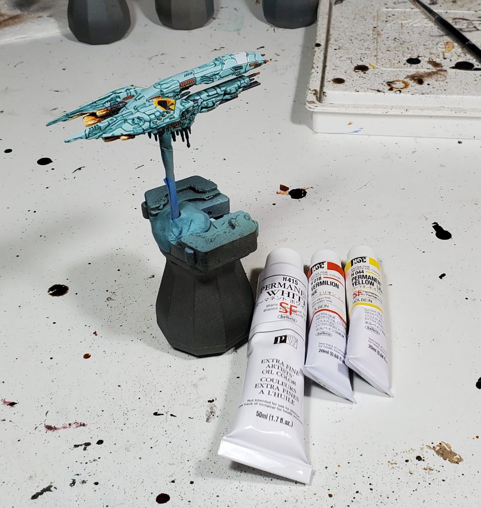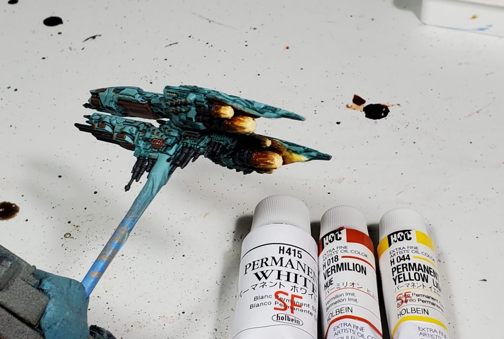 For the engines I start by dabbing half way down the cowling with Vermilion and then feathering it out and then introducing Permanent Yellow closer to the tip and feathering it back to get a rough transition. Then its just dabbing white on the engine tips and feathering into the rest, this should result in just a touch of yellow being in the hottest area and otherwise having a dramatic glow.
