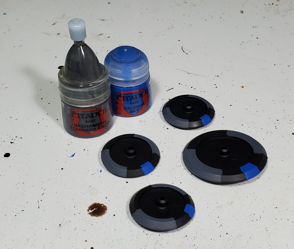 One other thing I did at this stage was use the accent color to paint the thin facing lines on the base, just to make them a little more visually distinct. I only painted the quarter markers, not the narrow front facing, mostly because I wanted to keep the base mostly black.
