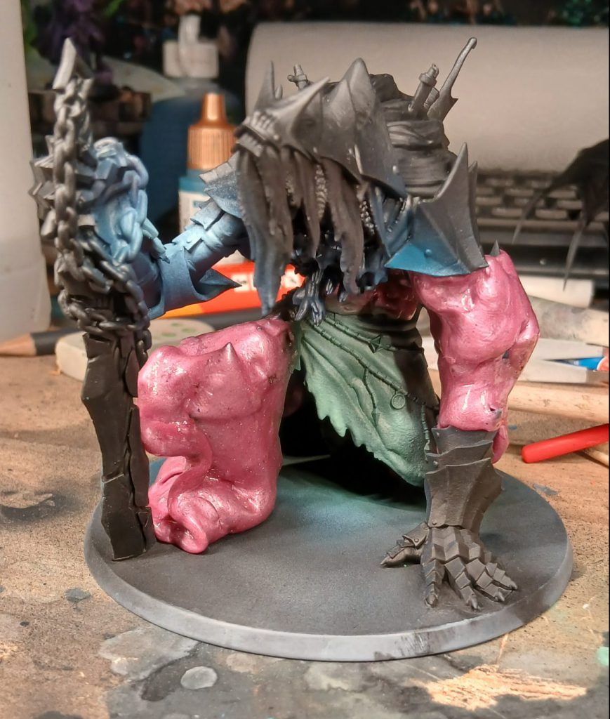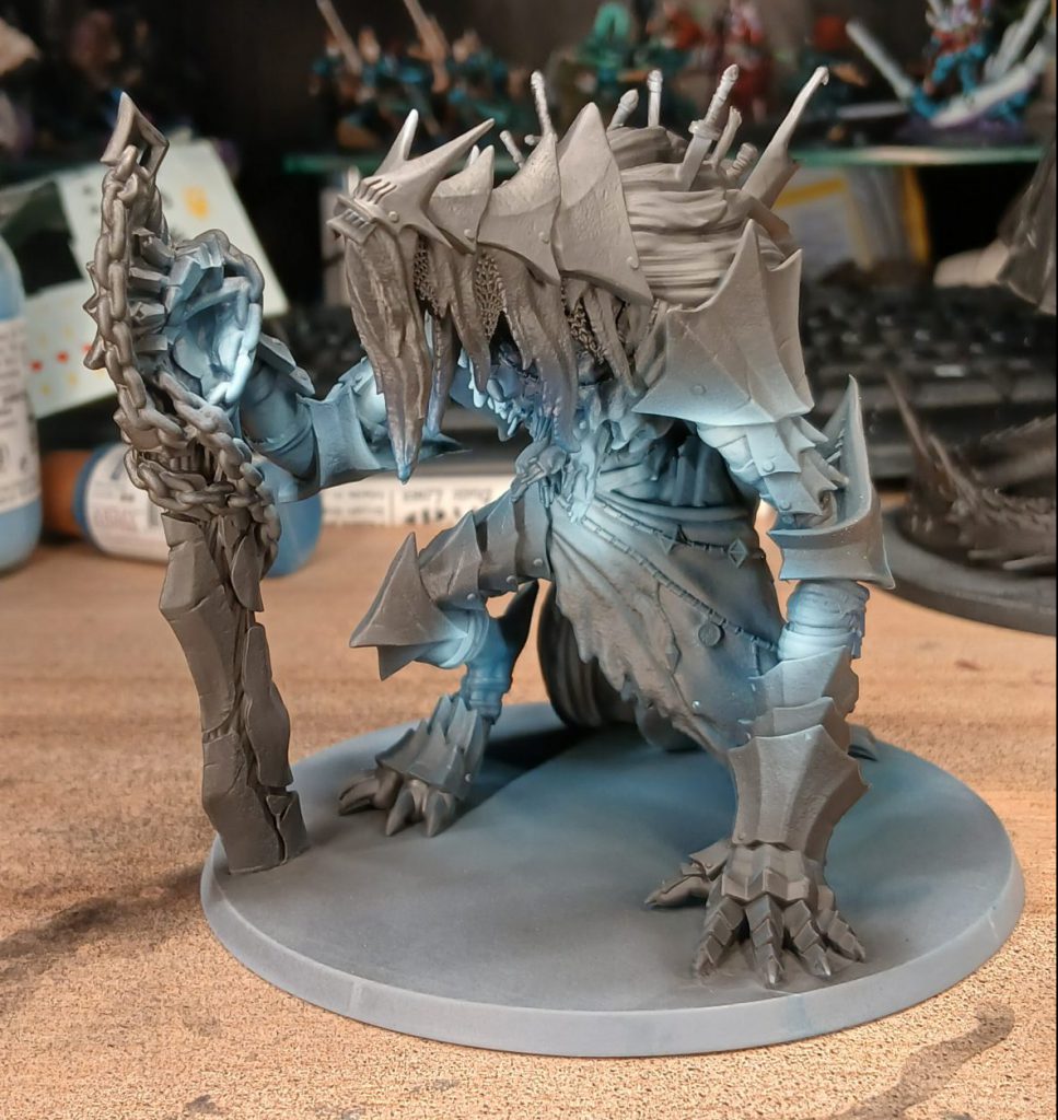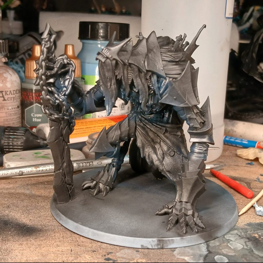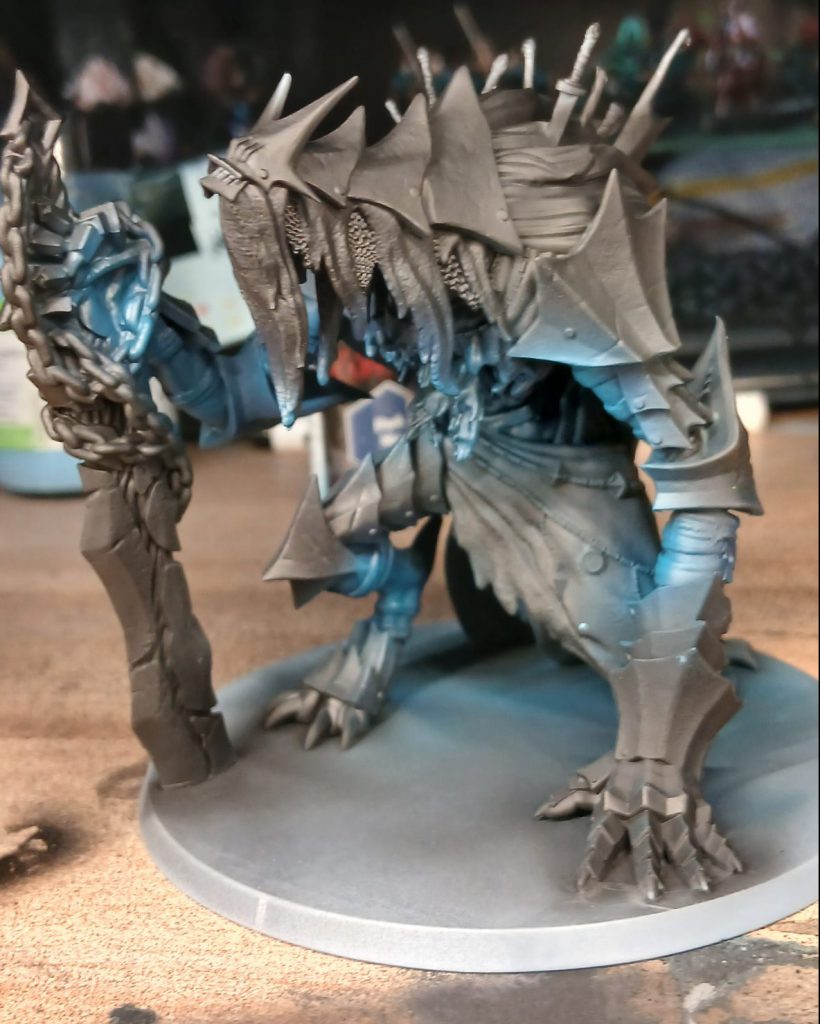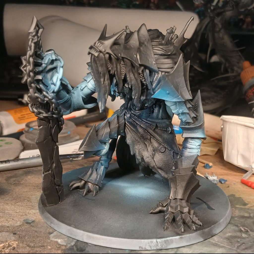 The first feature I'm going to paint on this Blighted Riftspawn is its cold blue skin. The name Northern Wind obviously conjures feelings of arctic coldness, so leaning into that iciness for this huge monster seems very apposite. I start by priming in black before spraying an all-over coat of Army Painter Air (hereafter referred to as APA) Thunder Storm, this colour is so dark that you might not even notice that it's different to the black primer, but it is, I promise!Tip: When you're spraying with the airbrush, try rocking the trigger a little so that you're not just spraying paint, but alternate between spraying paint and clean air, the air will dry the paint as you go (kinda like how the dentist dries your teeth with a blast of air when you get a filling), this will help you to lay down your coats more evenly without flooding the model and making a mess.