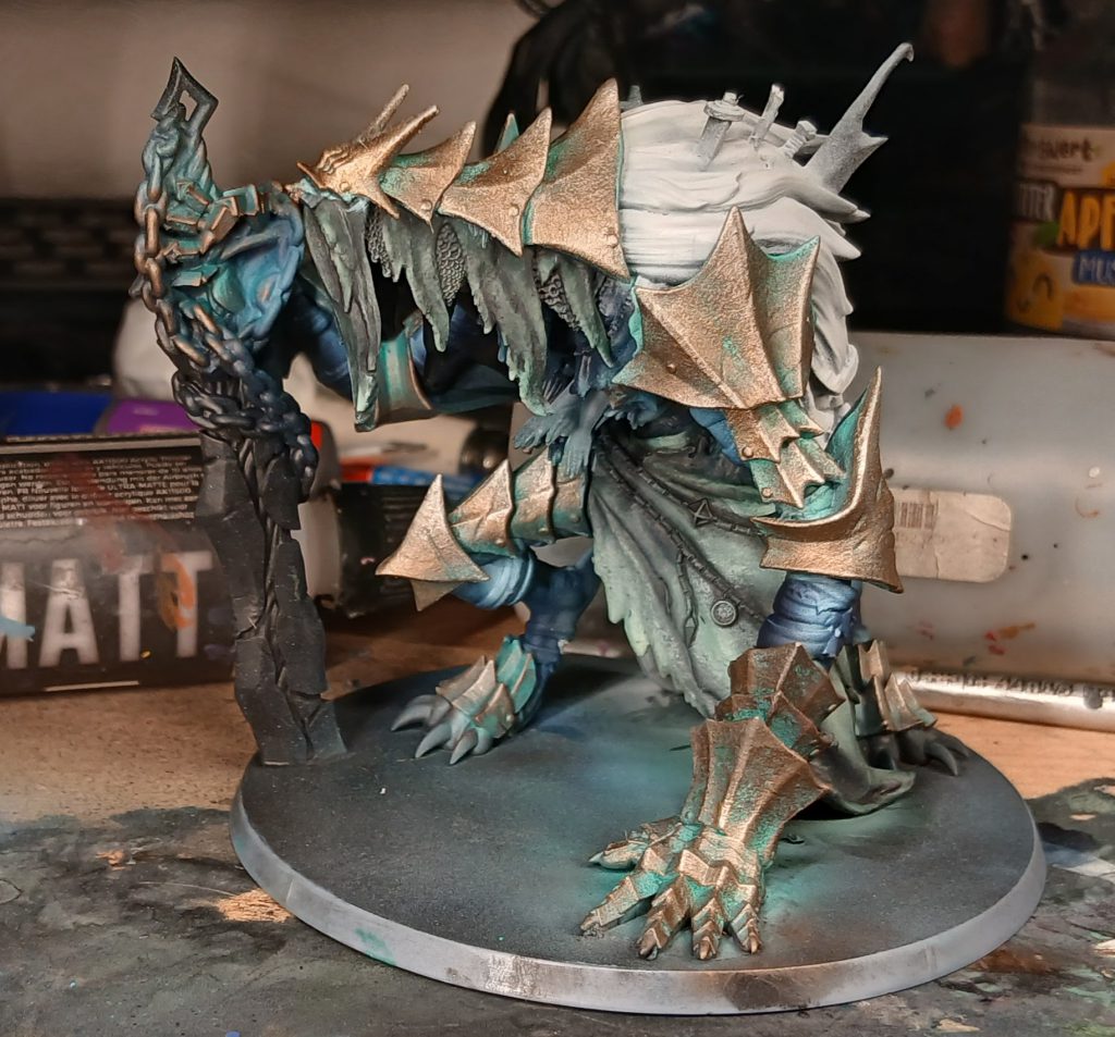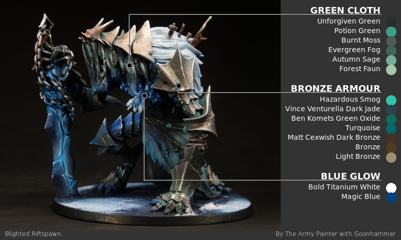 For the Riftspawn Armour, I decided to try something a bit different. My first instinct was to go with a sort of dark steel, but I changed my mind and settled on an ancient, aged bronze. I worked from a starting point of Verdigris, when Bronze is heavily oxidised, the oxide will rub off from the most exposed parts while remaining in the recesses. To that aim, I airbrush all the armour with either APA Psychic Shock or Hazardous Smog (I can't remember which, but both are perfect colours for a light verdigris!) If you're going to do this it's essential that you mask the parts you've already done somehow, since this method makes heavy use of messy techniques like stippling and drybrushing.