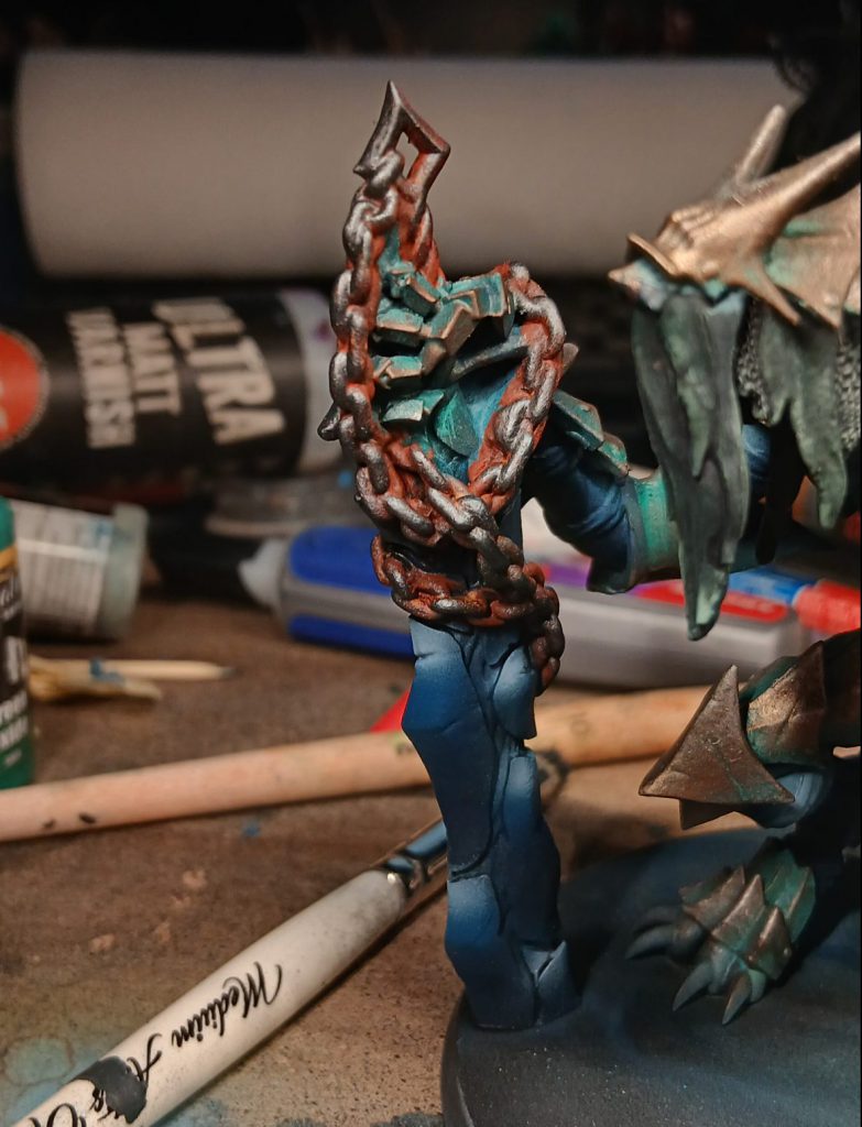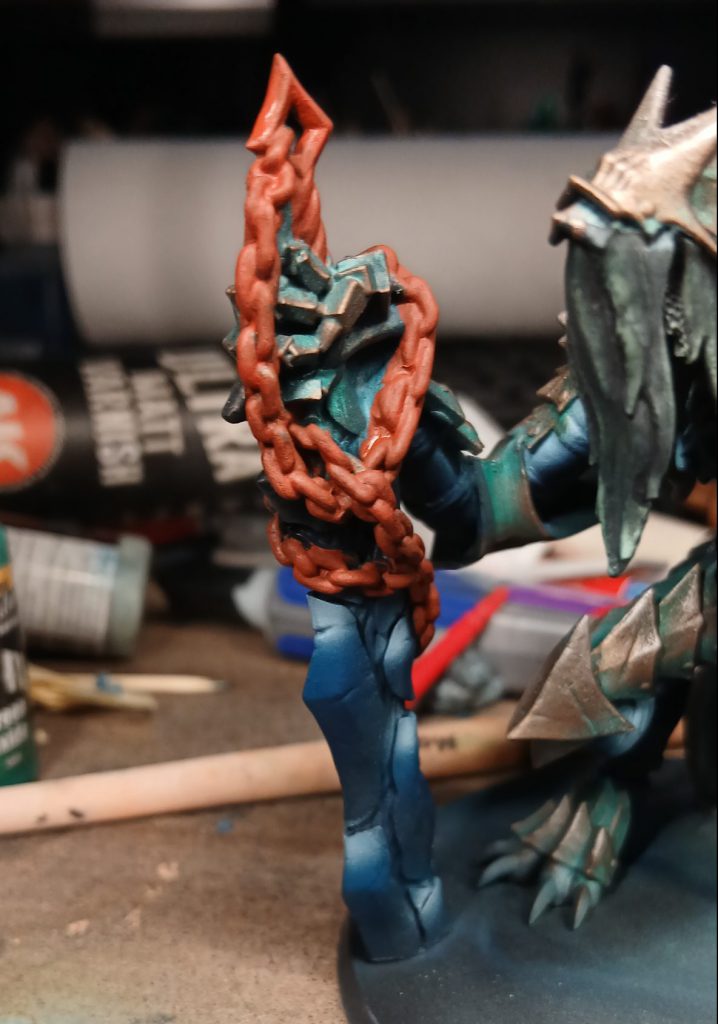 To add a little colour contrast to the general cold ambience of the model, I decide to paint the huge chain around the wrist and sword a rusted orange colour, beginning with ProAcryl Burnt Sienna. Once that's dry, I paint large highlights on the chains with ProAcryl Burnt Orange on the upward-facing parts, further increasing the contrast with another smaller highlight of ProAcryl Orange. Now that the chain is sufficiently rust coloured, it's time to make it look like metal via a drybrush of ProAcryl Dark Silver. i finish off the metallics with a final highlight drybrush of ProAcryl Silver.