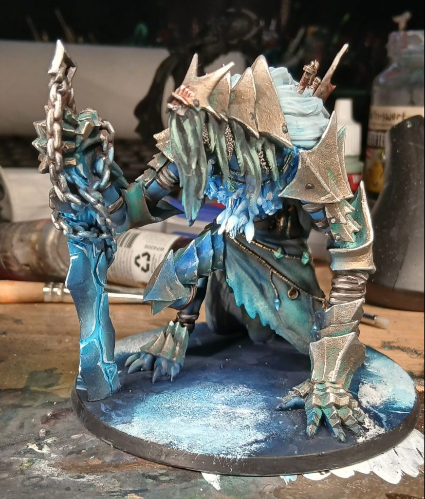 Continuing with the frozen Northern Wind theme, I turned the flat base into a sort of frozen lake using, once again, the colours AP Air Thunder Storm, Night Sky, and Twilight Sky. Coupled with some cracks painted in with ProAcryl Grey Blue and some Krautcover Powder Snow.