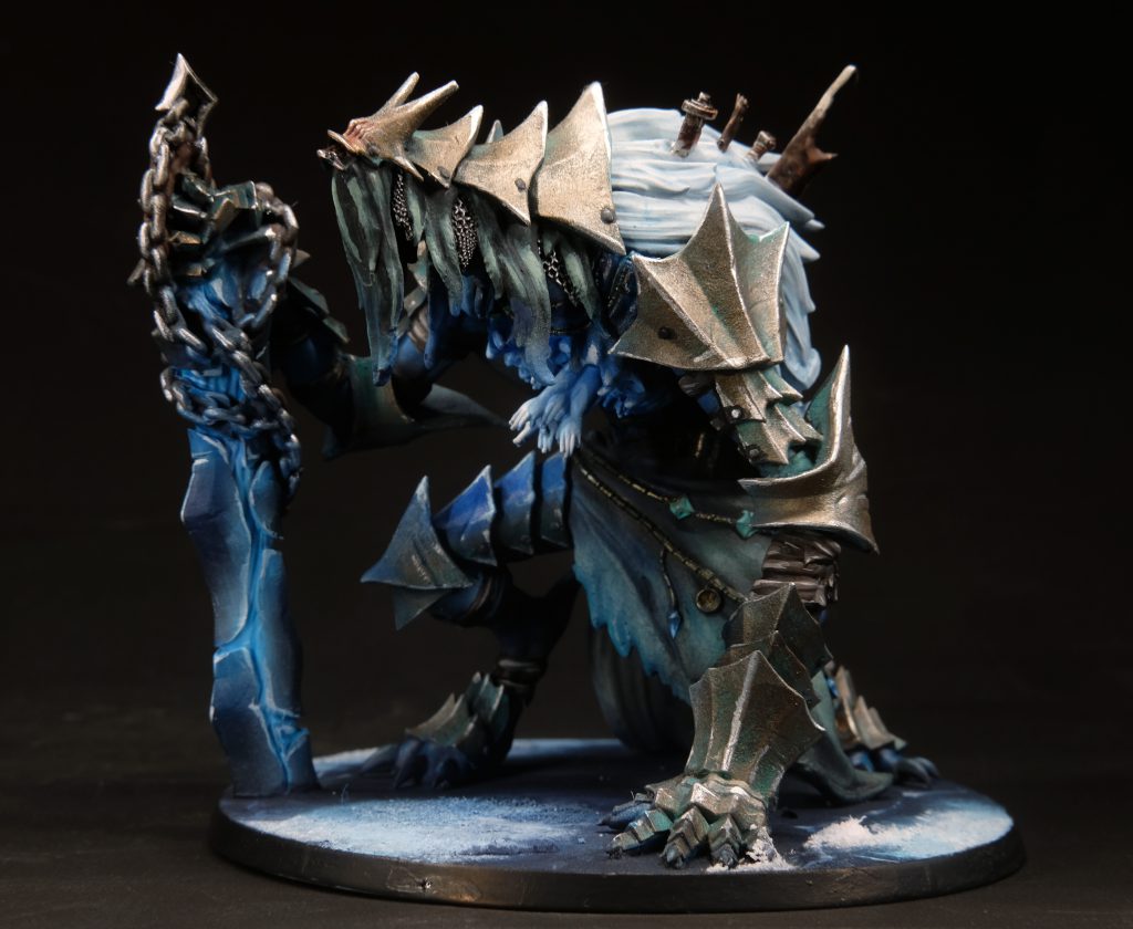 The spectral hands reaching out of the Riftspawn's chest are pretty important to sell the whole Dark Souls vibe it's got going on, so I want them to really stand out. I basecoat them with ProAcryl Bold Titanium White and while I'm at it, I paint a line of white in the cracks between the ice-shard-ish bits of the sword. To create the glow and colour blend the white hands into the body, I use AP SP Magic Blue. This is something of a high-wire act as, by this point, I've already painted pretty much everything, but fortune favours the bold after all. Using the airbrush and with very, very tiny trigger movements, I very carefully spray the Magic Blue at the point where spectral hands erupt from the monster's chest, intensifying the colour with more coats at the boundary.To create the OSL effects, I spray more Magic Blue on surfaces with a direct line to the hands. In order to figure out which parts would be affected by the OSL I move the model around a lot and draw lots of imaginary lines in my head. I really think that a good OSL can really boost a model to the next level, and using contrast-style paints as filters is a super-easy way of doing it.