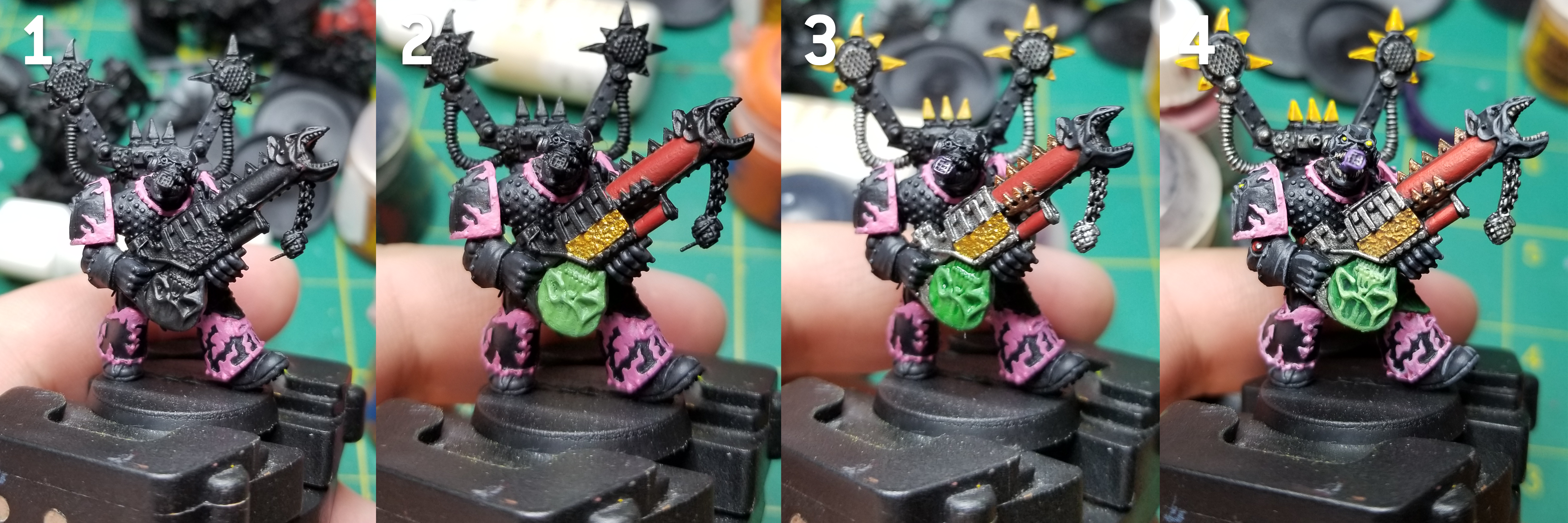 Credit: Robert "TheChirurgeon" JonesOn the more modern models there are some different details to get, and I've started doing more with greens like I've seen on the GW paint scheme. These are usually Caliban Green with highlights of Warpstone Glow and Moot Green, though I use more muted colors for hte topknots and tassles.