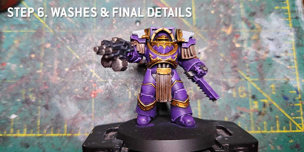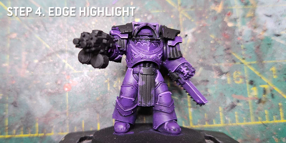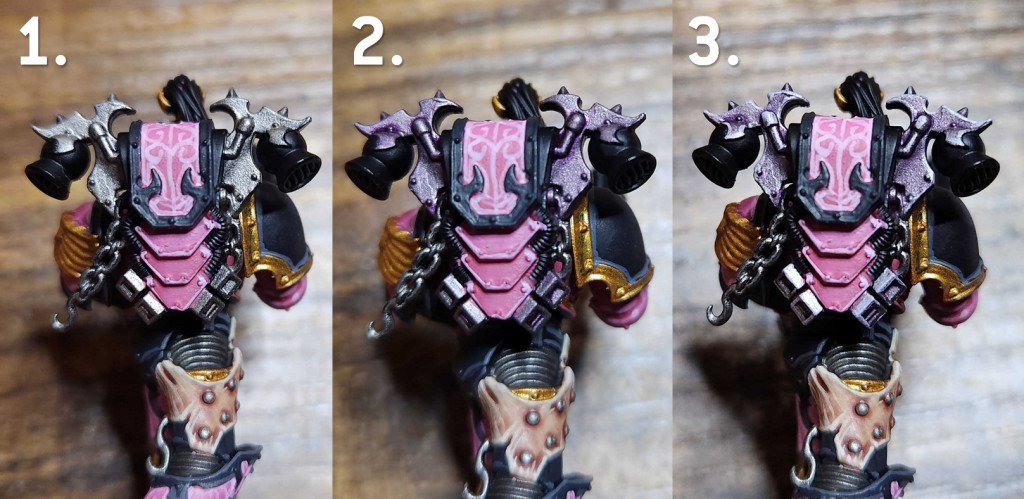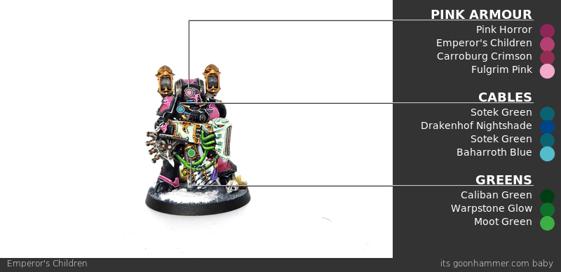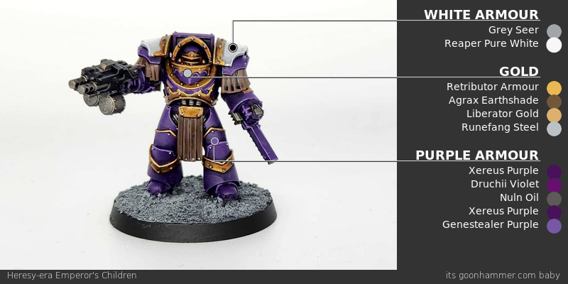 I still use the same method for the current modern Emperor's Chlidren kits, though I've started adding in some purple metal details at parts - see the tutorial above for more on how to paint purple metal.