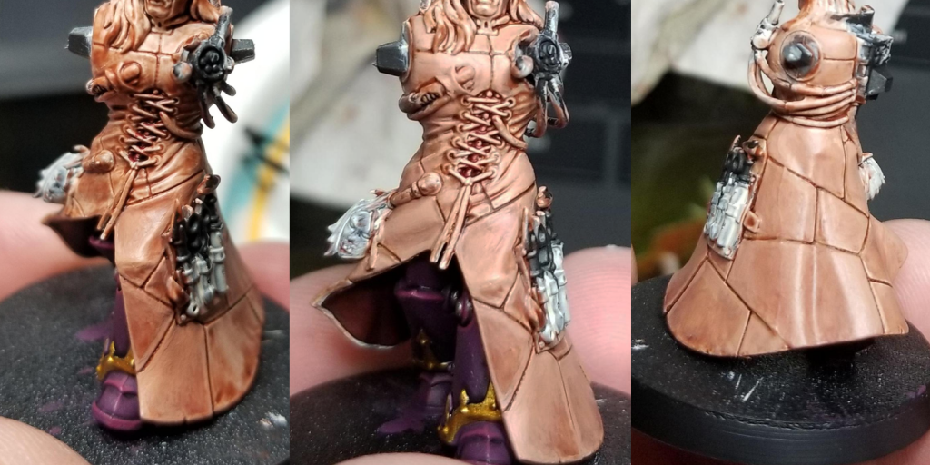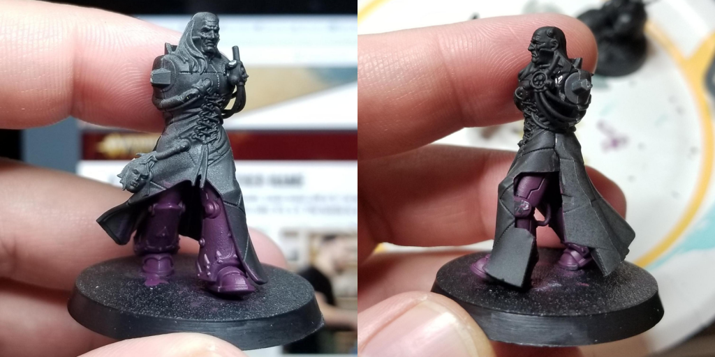 I knew I wanted to work on Bile in a few parts in order to make my life easier and hit some of the harder-to-reach areas of the model. So I started by painting his legs with a 20/80 mix of Naggaroth Night and Screamer Pink, then I put the basic model together with his cloak. I probably should have painted the cloak lining before this step, but I was still able to reach enough of those parts that I felt good about them. There's a panel on the side of the cloak with his tools that can be glued on separately, and leaving it off allowed me to get good angles on the interior of the cloak and the legs before I glued it in place.