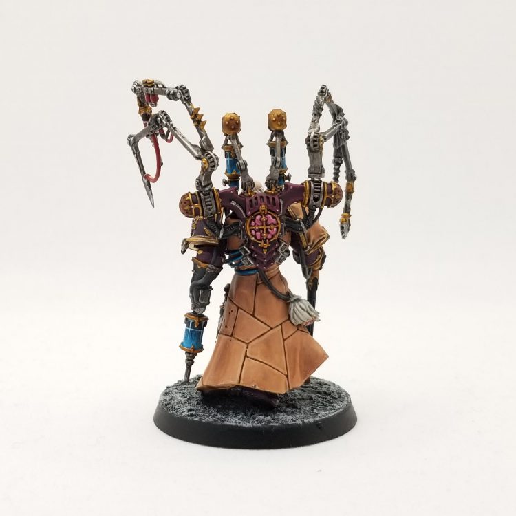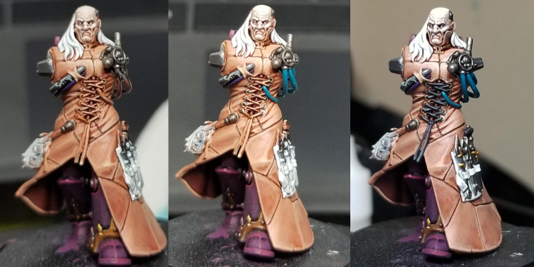 I've also cleaned up the cloak a little more and done some edge highlights with a mix of Cadian Fleshtone and Flayed One and in a couple places on the chest, a spot of Reaper Polished Bone. For the tools on his side, I painted the holster Reaper Pure White, then washed it with Apothecary White Contrast Paint and then highlighted it with Reaper Pure White. The tools are mostly Leadbelcher washed with Nuln Oil and highlighted with Ironbreaker and the black parts/handles are done with Coruvs Black and Mechanicus Standard Grey.