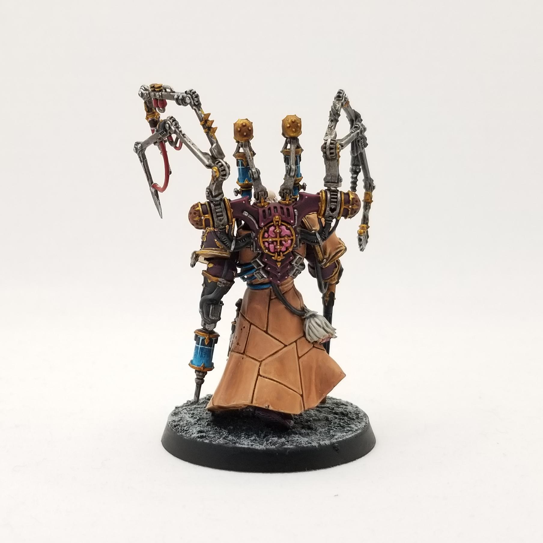 OK, now the backpack goes on and I can finish it off by doing the last vial and coloring a lot of the remaining details. Most of these are cables, but there's some gold trim and black/dark gray spots. The only notable thing left is the brain for the Chirurgeon backpack; I paint this with Emperor's Children Pink, then wash it with Carroburg Crimson before re-highlighting it with Emperor's Children and a mix of EC and Pure White. Then it gets a gloss coat of 'Ardcoat to make it look like wet brains.