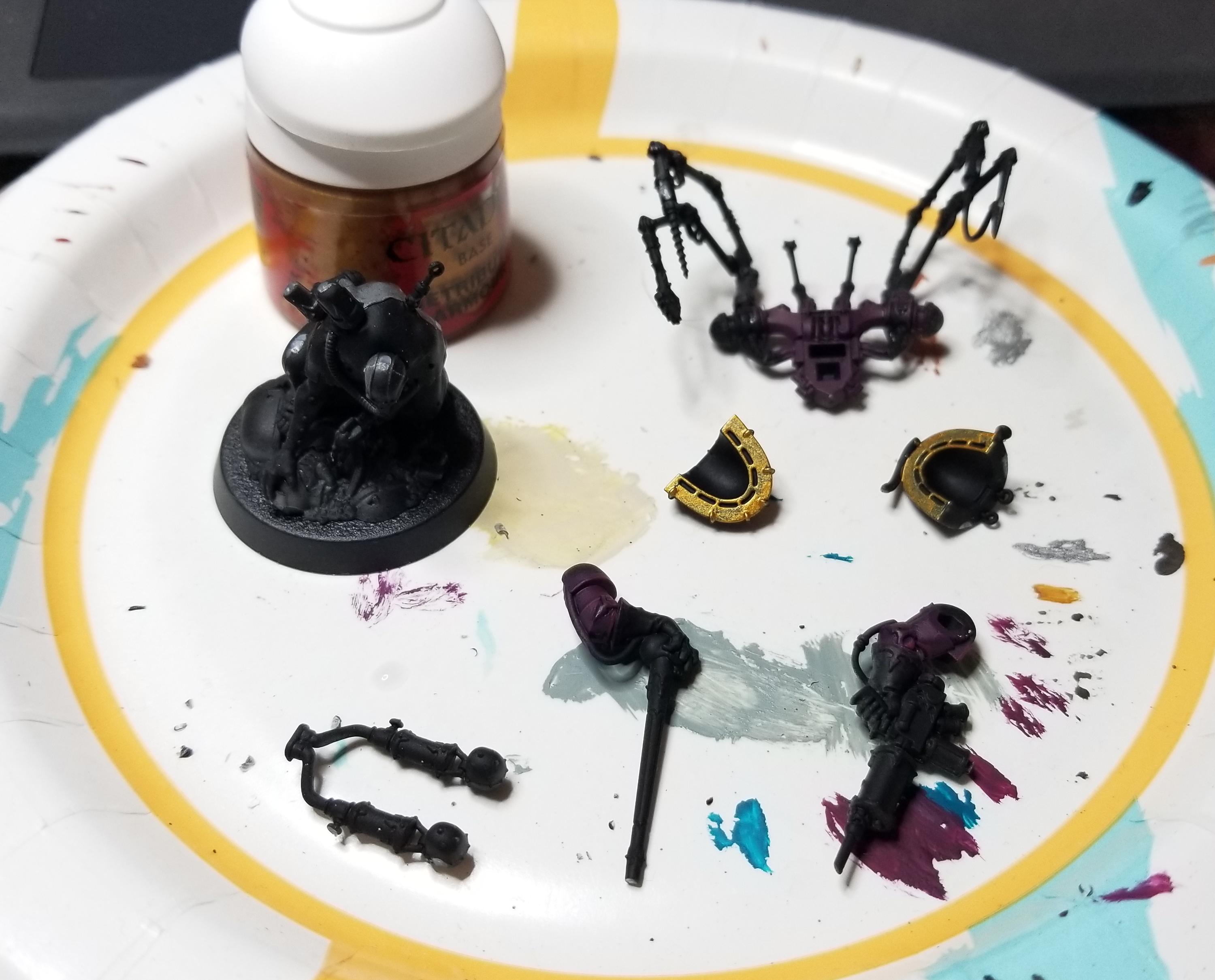 Back to the arms. I paint them separately but not necessary completely, before gluing them on. I also base the model before the arms go on, to ensure that I don't accidentally paint the Rod of Torment when I'm drybrushing the base. The base is just Astrogranite texture paint washed with Nuln Oil and drybrushed with Celestra Grey. I also paint the inside/under rims on the shoulder pads before they get glued on, to make it less of a pain in the ass to get them on.