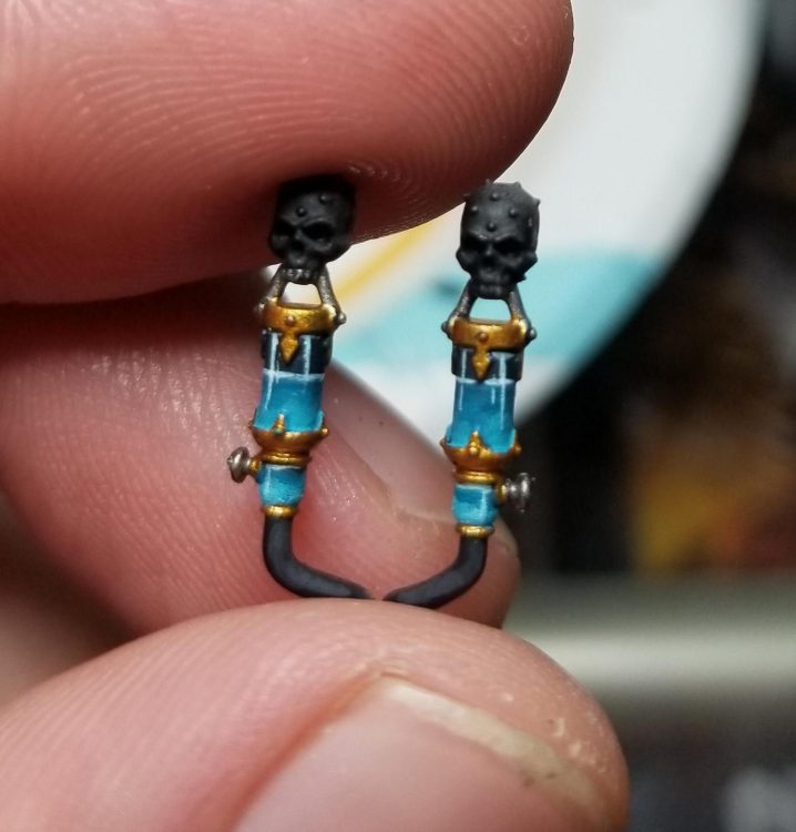 Same process on the backpack vials, with the only difference being that the lower vials are already full, so they start with a full coat of Sotek Green and work up from there.