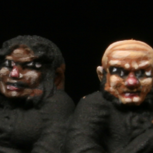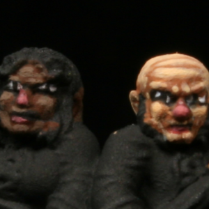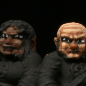 My mantra: "just layer, baby"You can add a ton of personality to your tiny people by leaving slivers of your base coat in strategic places. A line going from the edge of the nose to the edge of the lips will bring out a smile or grimace. Horizontal lines along the brow will make the figure look old and haggard. Ball shapes above and between the eyes make an angry, furrowed brow. A ball shape under the eye makes bags under the eyes. A small vertical line on the chin makes a dimple.
