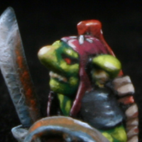 For the mouth, we ultimately only care about the bottom lip. If you got any paint on the lip while you were layering up the flesh, then restore the black. Base coat the lip with a dark red. Leave a sliver of black around the lip if you can. Mid tone with a pale pink and add a highlight dot on one side. Lips are a brush control challenge, but really make a face look good.A reddish nose adds some character. Base coat the nose with the same red that you used for lips. Mix the red with your flesh tones as you layer up. You can use your paint to imply a lot of different nose shapes. A vertical highlight from brow to tip will make a long “roman” nose. Leaving a horizontal strip of base coat in the middle will give the nose a bulbous or upturned look. Bring out the nostrils with a single tiny dot on each side of the nose.