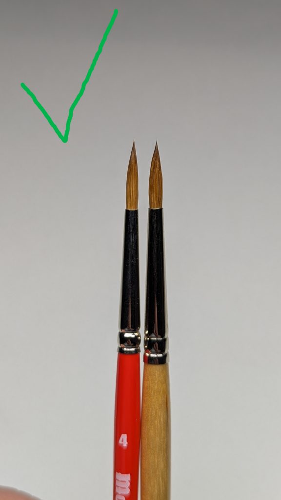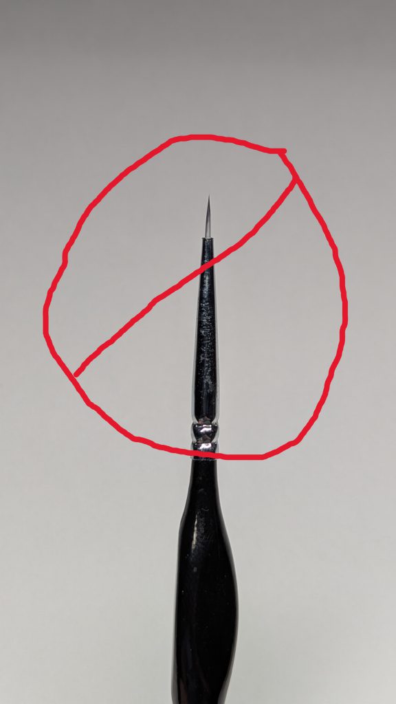 Now, let’s talk about the big one; the brush. I could write an entire article on this (and might), but I’ll keep it to the basics. You will want a Kolinksy sable (or similar natural hair) brush. There are dozens of brands out there and you may not know where to start. My recommendation for US painters, a Dick Blick Masterstroke Red Sable short-handled round, size 2-3. For EU/outside US painters, maybe try an Element Games Kolinksy Regiment brush. I recommend these because they are readily available and relatively cheap (10-13 currency) for what you are getting so you don’t need to worry about “messing up” your fancy brush while you’re learning a new technique. If you have a brand you prefer to try instead, knock yourself out. What you are essentially looking for is something with a sharp point and a large belly (insert average wargamer joke here.) You do not want a teeny tiny brush with 3 bristles on it that are 2 cm long. The reason for this is that you do not want the paint drying out in your brush before you go from your palette to your model. If there is nowhere for your brush to store moisture, that is what’s going to happen. Then when you go to dot the eye, nothing is going to happen. Then you’ll try to dot it again…and again…and again…and then the entire contents of the brush will spooge out the end of your brush and gum up your model’s eye socket and you’re going to have a bad time. See the below pic for an example of what you’re looking for, and what you should avoid. Same advice applies for free handing, but that’s a different topic for another day.