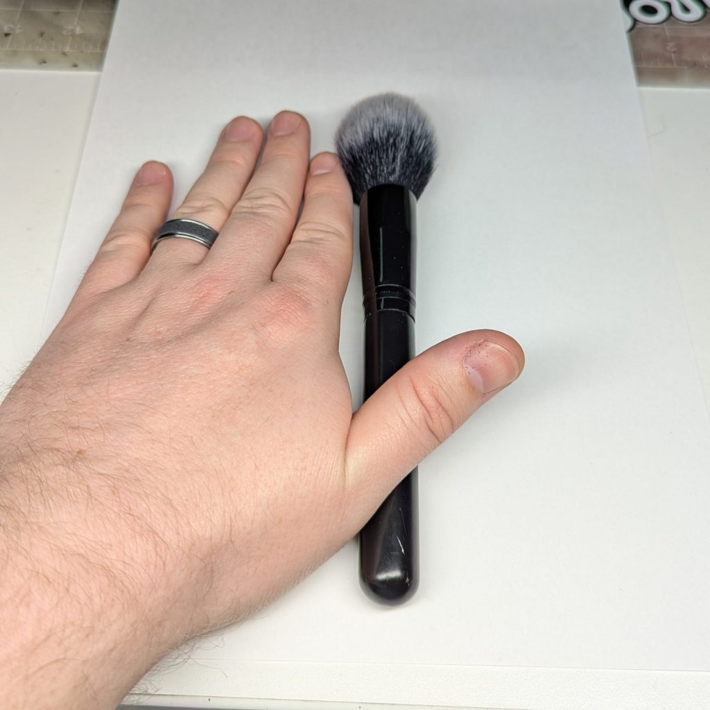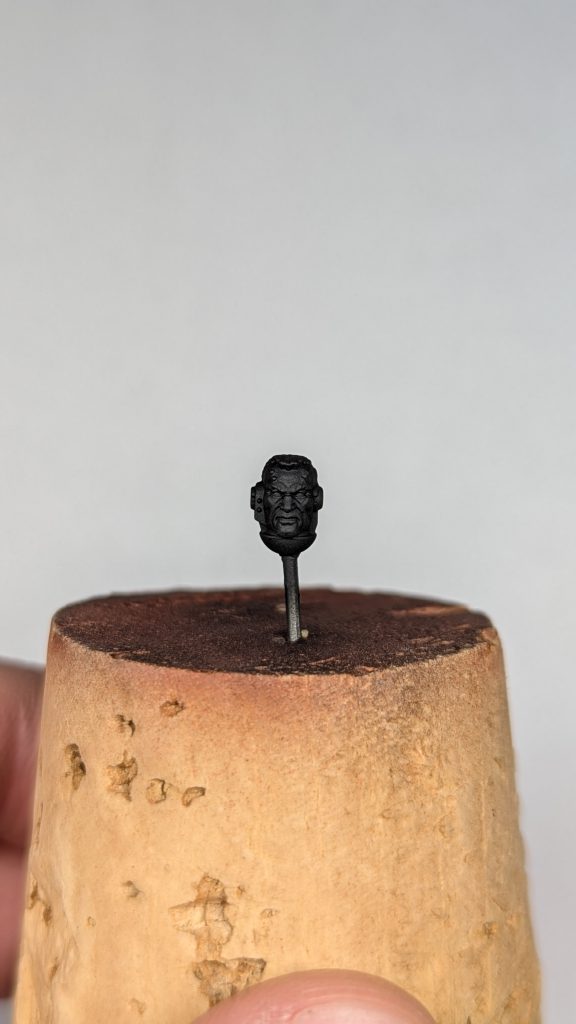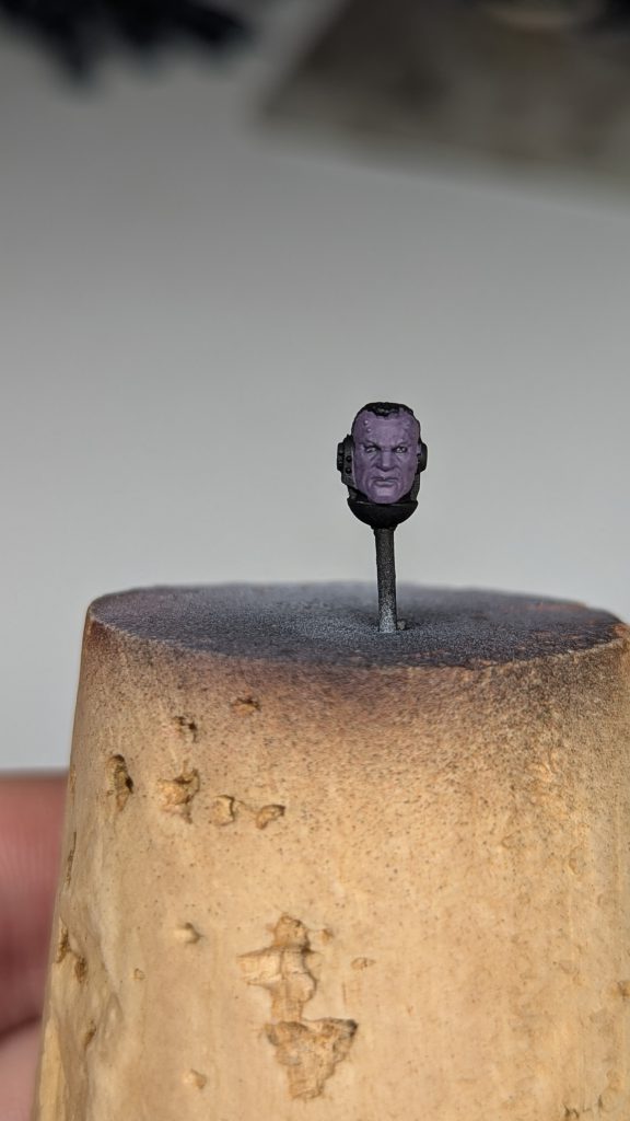 It is always a good idea to dust your models before you sit down to paint, but that goes double when you’re going to paint a face. Even small particles left on the surface of your model will make it impossible to get a smooth finish in your figure, and over time will create texture with the layers you will be adding. This is one of the few things that can’t be fixed without starting over or at the very least setting you way back. I just have an oversized makeup brush that I give my models a pass over with before I start painting. If you buy a set from any online retailer or store for dry brushing, you will likely have one floating around somewhere. Trust me; it takes like two seconds, and it can save you a world of pain later.