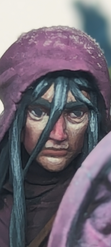 Second; as you’re all well aware, the face on a 28mm/wargaming sized model is small. Like, really small. As such, textures can build up quickly and ruin an otherwise fine paint job if you’re not careful (see earlier warning about dust.) Once you have your stable position, you want to work on your strokes. Have a light touch with your brush and put your paint on as lightly as you can. This may come as a surprise to you, but bearing down on your model like a toddler with a crayon will work against you and you will likely end up putting more paint on it than you intend. Too much paint increases the chance that you will create unwanted textures. Which leads me to—