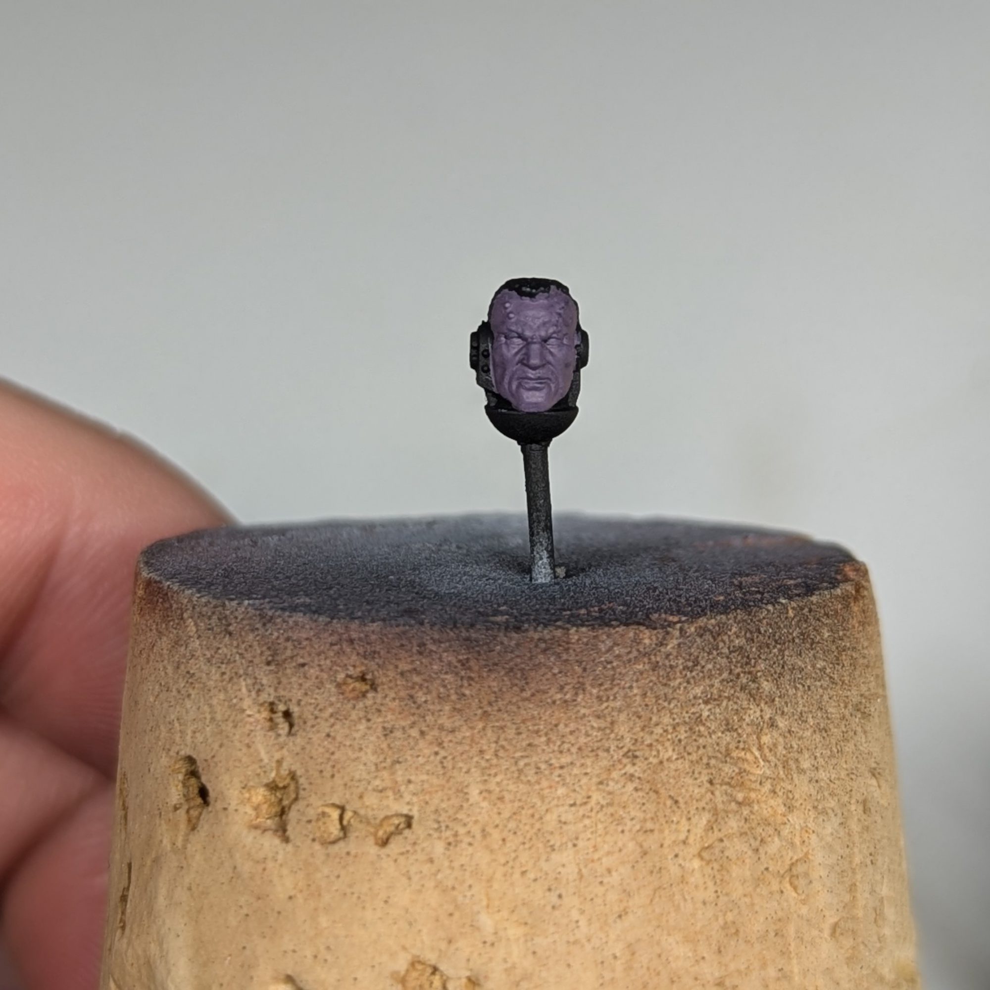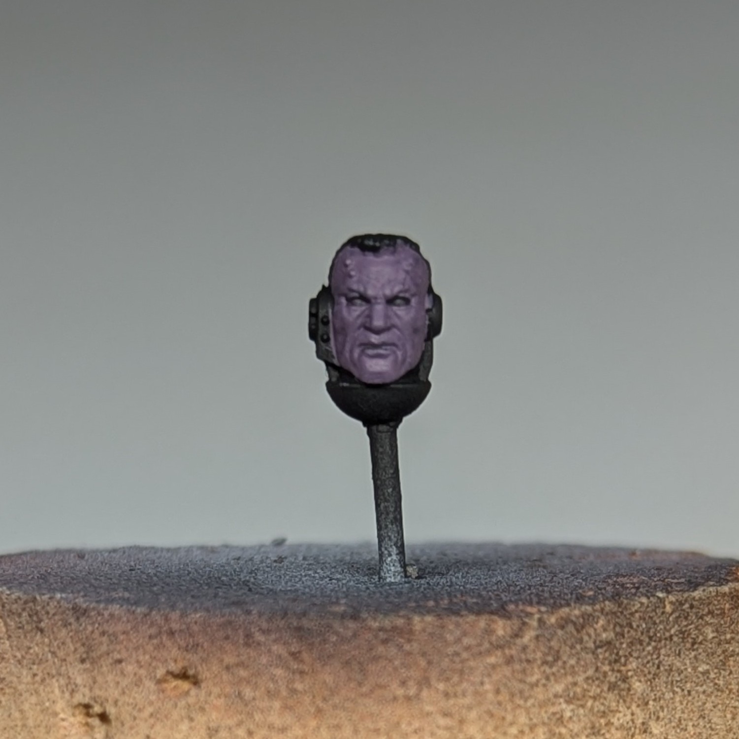 We will be painting a head from the new(ish) Horus Heresy Melee Weapons Upgrade box. I have primed it black. In the first article, I talked about doing a zenithal highlight or pre-shade as a light map (or as a base coat for easy wash or Contrast type paint application.) I encourage you to still try it out, but for this face I skipped that step as I did not feel I needed it. Plus, working with thicker layers of paint like I will be makes it unnecessary pretty quickly.I primed this head through an airbrush using Pro Acryl Black primer. Prime as you see fit, but remember my warnings about tearing paint from the last article, so I recommend an airbrush or rattle can primer rather than a brush-on primer