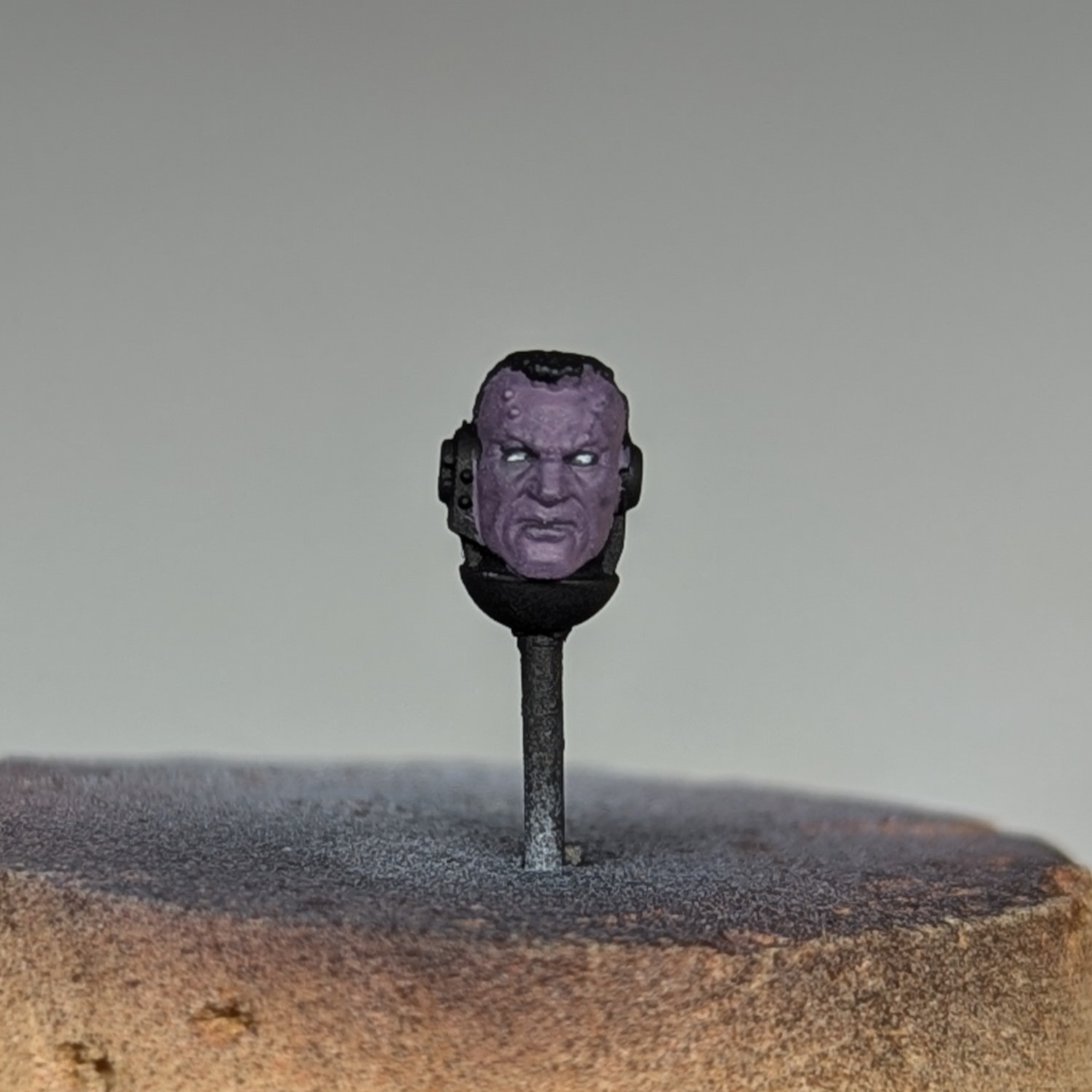 As discussed in the last article, some people can find it helpful to start with painting the eyes. I went ahead and base-coated the face using a mix of the Dark Magenta and Coal Black for this dark purple color.