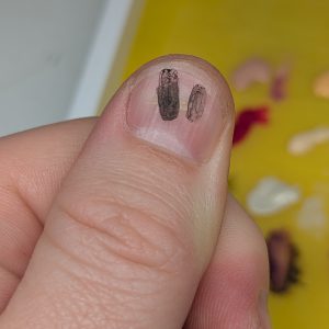 Glaze consistency tested on my thumbnail (to the left) Credit: MeltabombedLastly is the aforementioned wash. We all know what a wash is, we’ve all used them. Thin paint, allowed to flood the model and go into the recesses. I really only used one wash in this process and it was very targeted.
